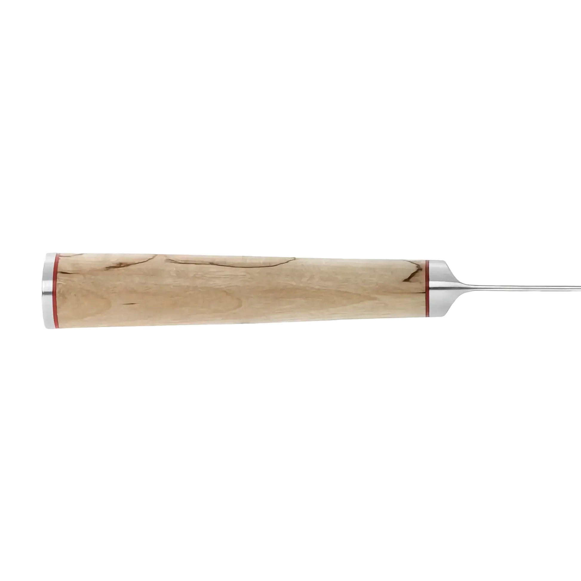 The GYUTOH knife, measuring 20 cm long, from the MIYABI 5000MCD series, stands out for its slender yet sturdy blade featuring an authentic Japanese profile. Its cutting edge is symmetrically honed at a precise angle of 19°, granting the dual-edged Honbazuke blade exceptional sharpness, facilitating even the most delicate tasks effortlessly. Comprised of a Micro Carbide MC63 powder steel core encased in an additional 100 layers of steel, the blade boasts remarkable durability and performance.