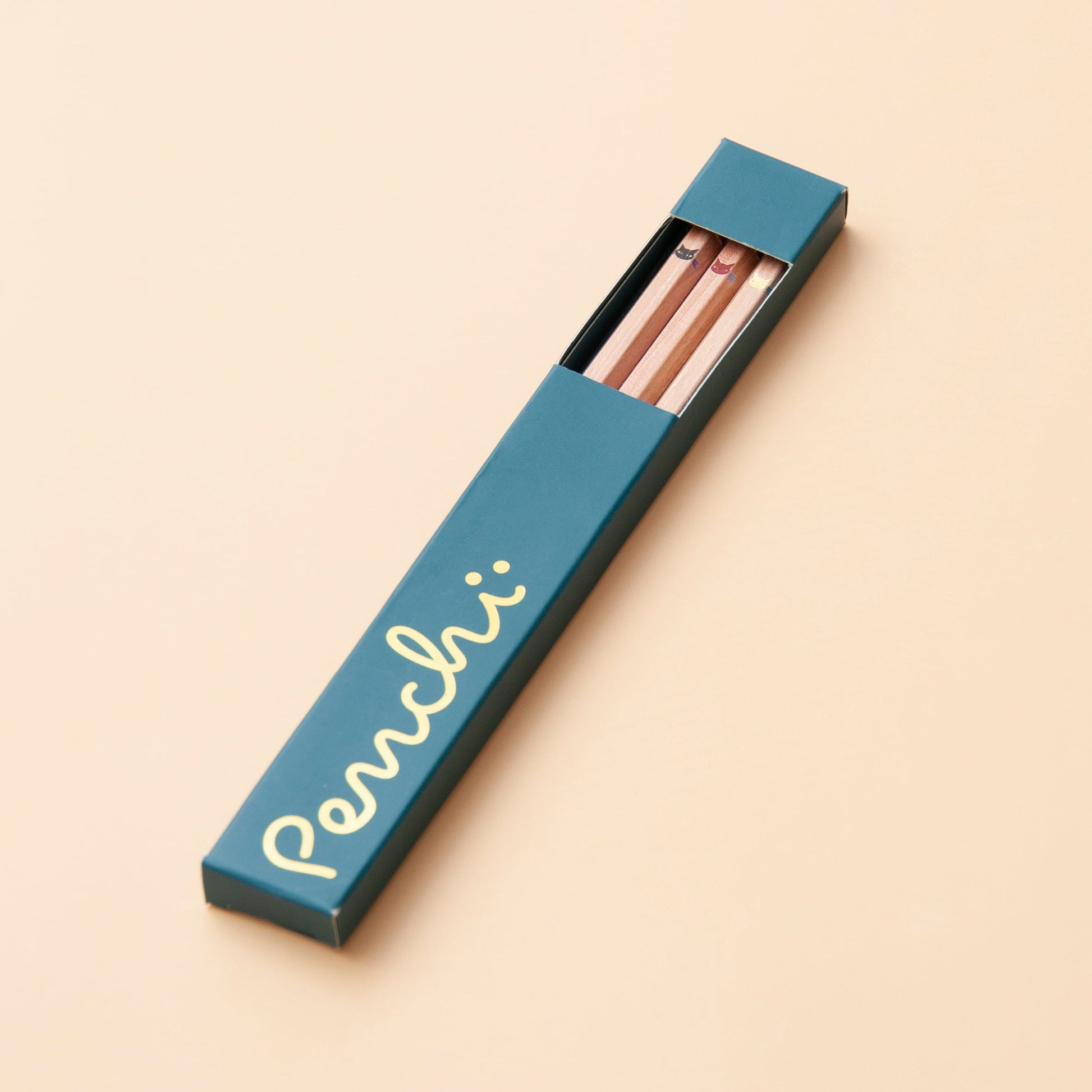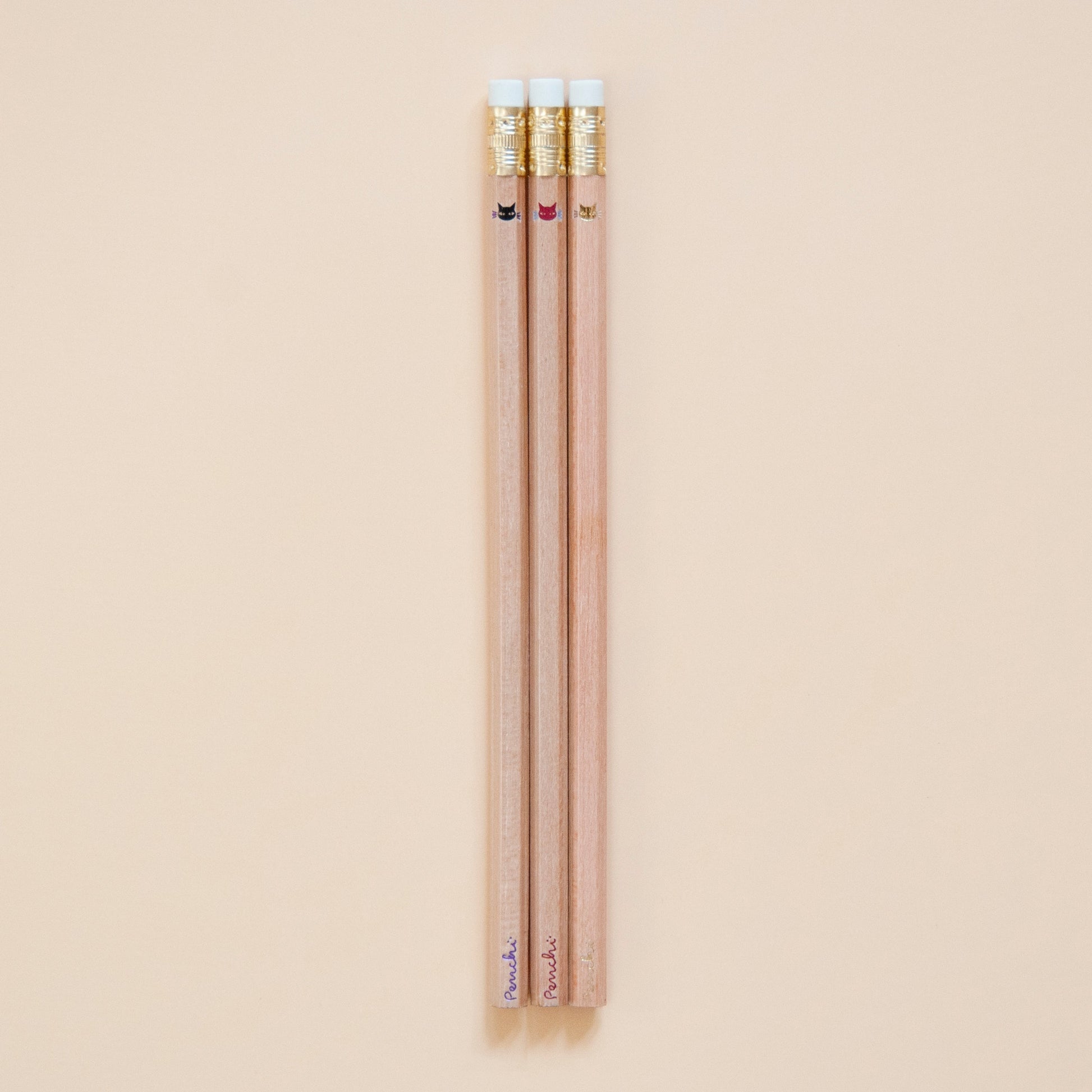This novelty pencil set features a cute little kitty face on one panel, with large whiskers stamped on the two side panels. In this set (Set 1) the cat face and whiskers are both stamped using different colours. The remaining pencils are stamped using the same colour.