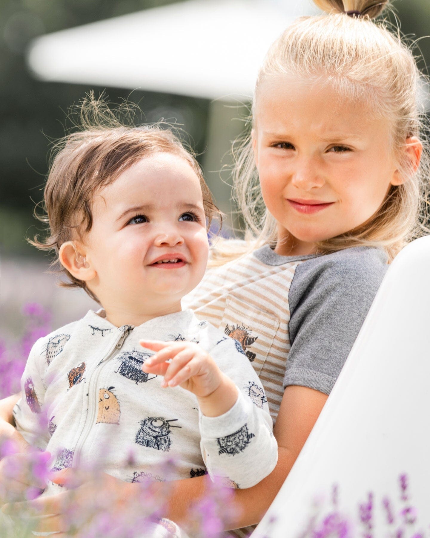 Little ones can snuggle up in style in our Organic Cotton One Piece Pajama Heather Beige Printed Monsters. Featuring an allover print with solid trim at the neck and cuffs, this super soft footie features long sleeves, an asymmetrical zipper closure, and a small logo label. Pair with a matching hat and bib set for head to toe charm!