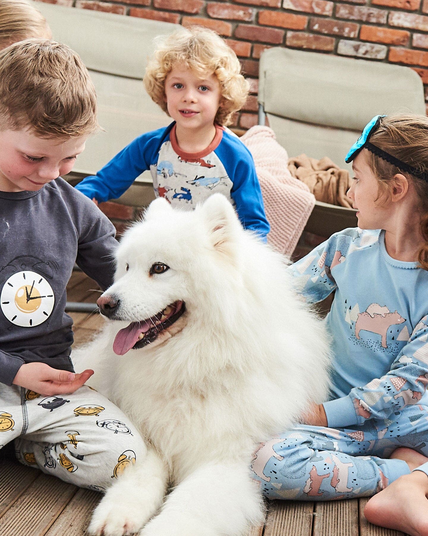Make bedtime a bit more fun with our Organic Cotton Two Piece Pajama Set Gray Printed Egg-O-Clock. The top features long raglan sleeves, a round neckline, and a sunny side up egg alarm clock on the chest. The coordinating pant has an easy pull-on fit with a stretch elastic waistband, solid trim, and a playful allover alarm clock print.