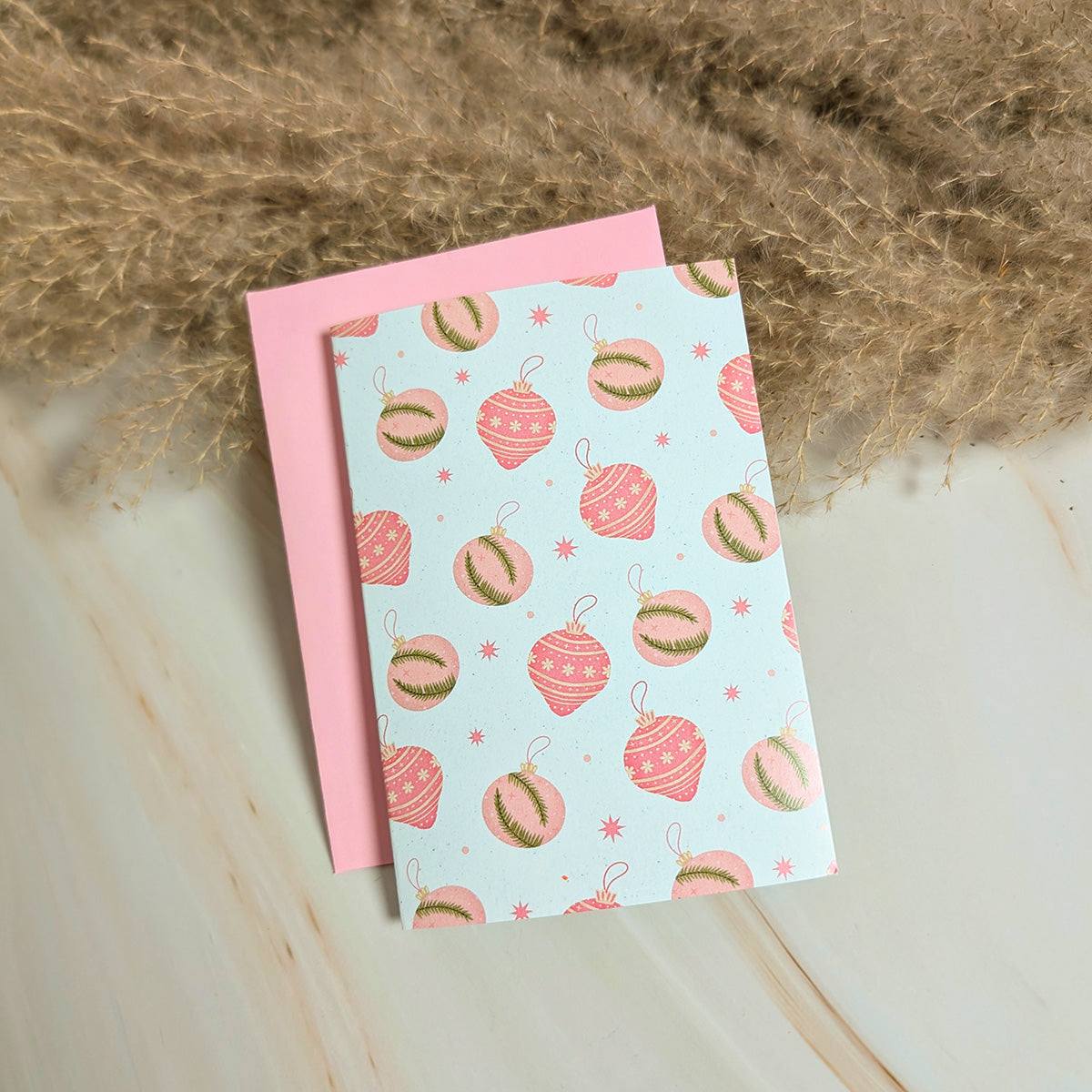 Bring festive cheer with our Ornament Overload Card, available in three charming colors: pink, green, and multi-color. Each card features a delightful pattern of ornaments, perfect for spreading holiday joy. With a blank inside, there’s plenty of room to add your own seasonal message.