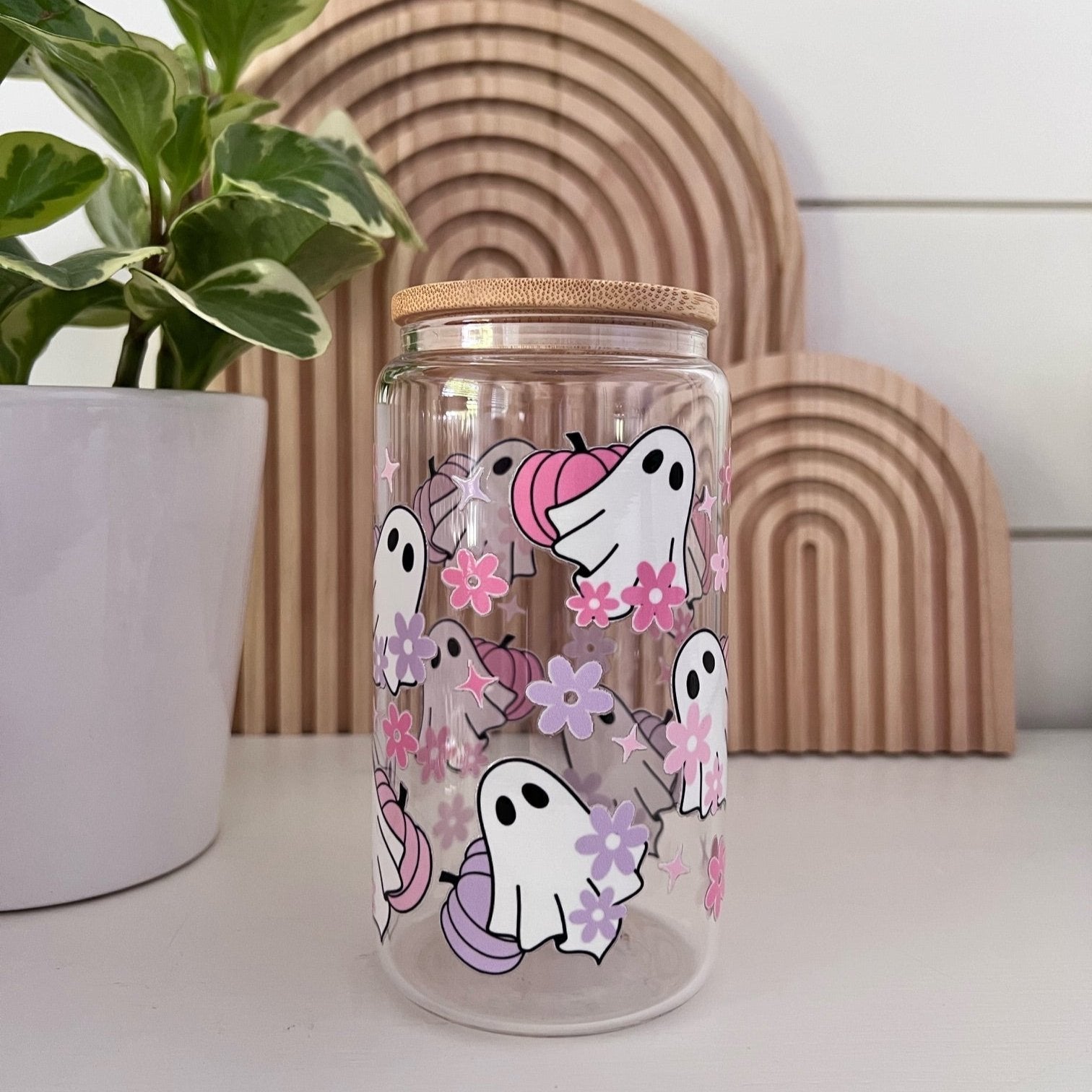 Add some spooky charm to your drinkware collection with our Pastel Ghost Glass Cup! Featuring playful ghosts and fun pastel pumpkin designs, this stylish glass cup will be sure to bring a smile to your face. Elevate your sipping experience and show off your unique style with this must-have cup.