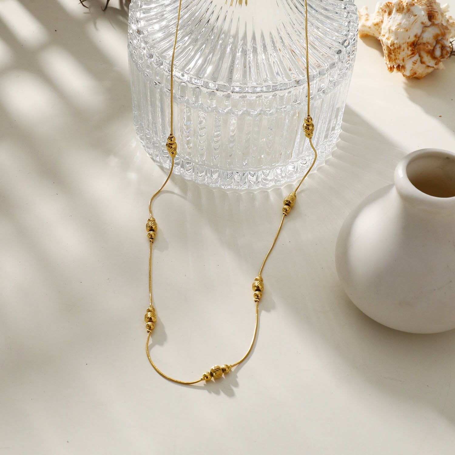 Stations of three beads bring a stylishly ornate touch to this delicate snake skin textured chain. A perfect addition to any classic ensemble.