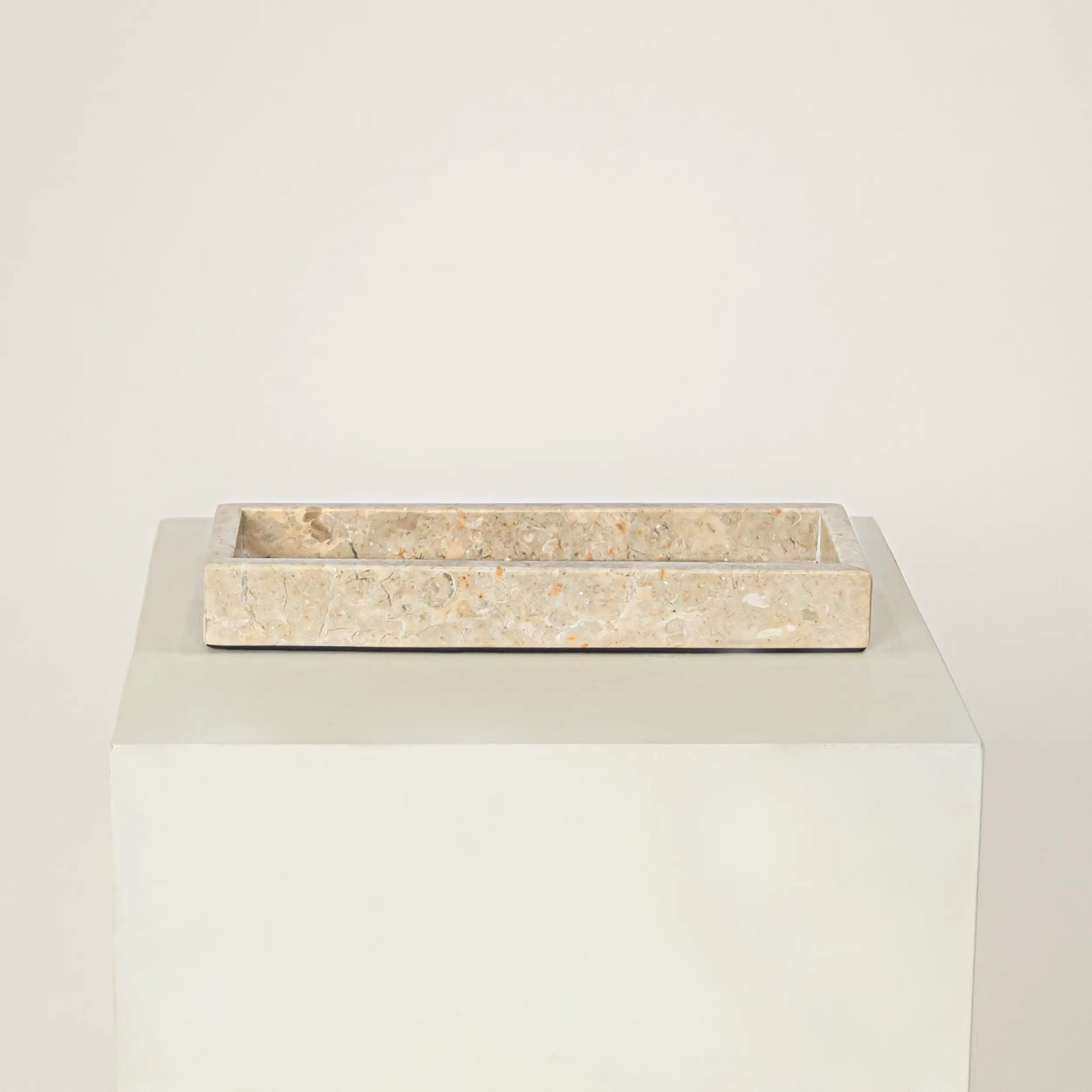 Le plateau en marbre, avec sa silhouette rectangulaire et ses bords soigneusement relevés, incarne l'élégance et la fonctionnalité dans chaque détail. Conçu pour servir une gamme variée d'utilisations, sa taille est parfaitement adaptée pour disposer des apéritifs raffinés, des boissons ou pour être utilisé comme une surface de présentation élégante qui capte l'attention. Le marbre, matériau noble et intemporel, ajoute une touche de luxe et de sophistication à tout environnement, tout en étant remarquablement durable. Que ce soit pour ajouter une note d'élégance à vos soirées entre amis ou pour mettre en valeur des objets décoratifs, ce plateau est un choix incontestable qui allie beauté naturelle et polyvalence.