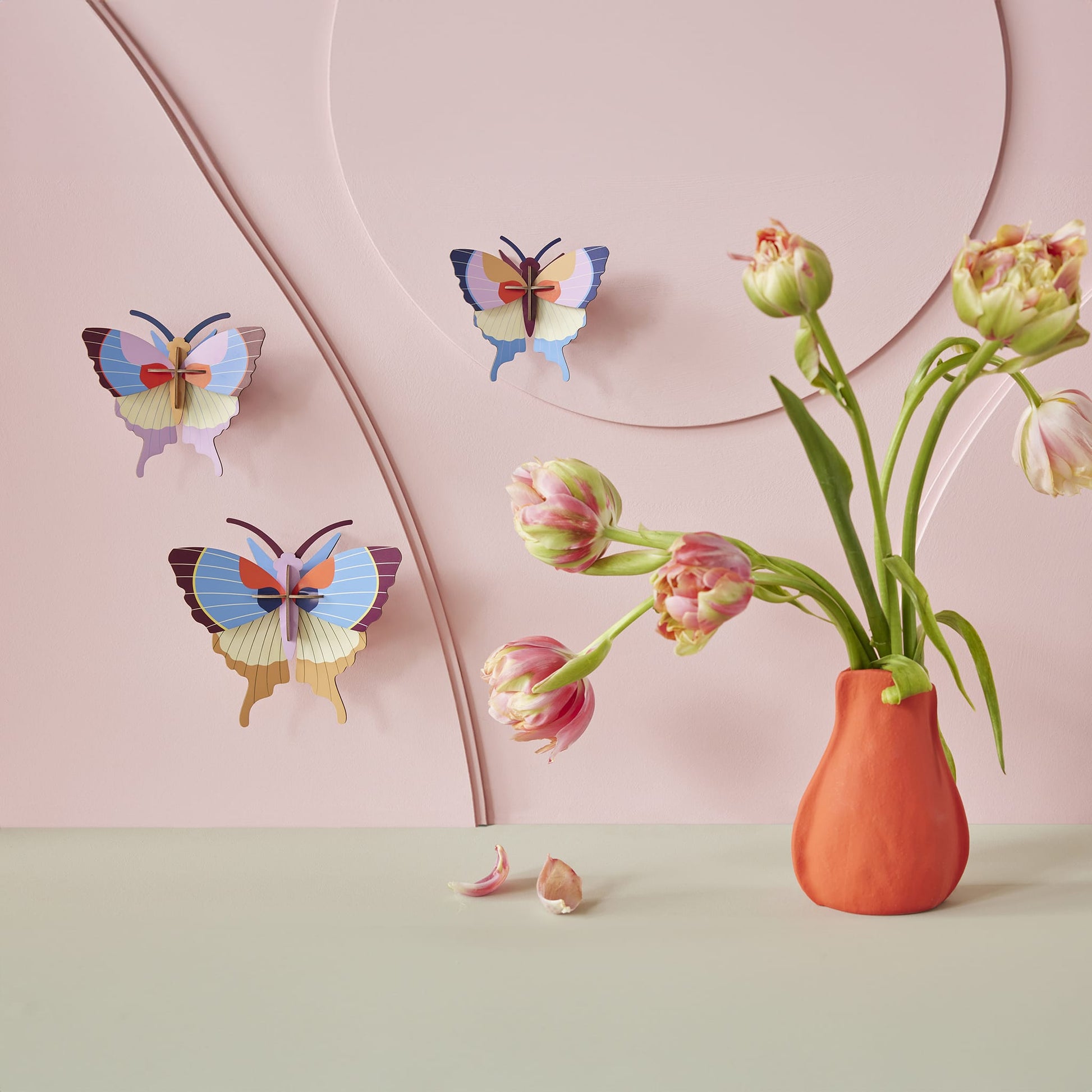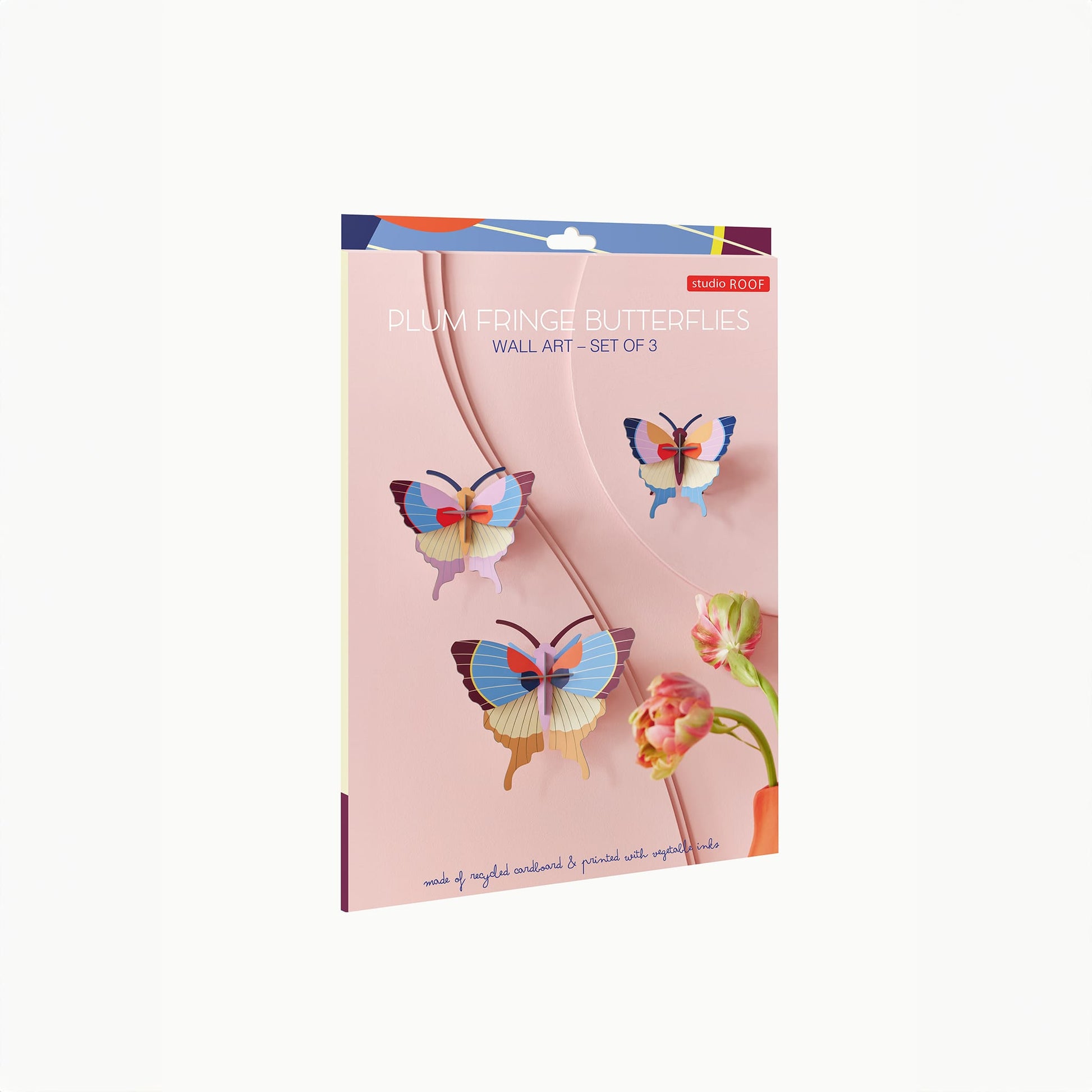 The Plum Fringe Butterflies set by Studio Roof brings a touch of nature-inspired art into your home with three delicate and vibrant 3D butterflies. Made from recycled cardboard and printed with eco-friendly vegetable inks, these butterflies offer an enchanting way to decorate your walls.