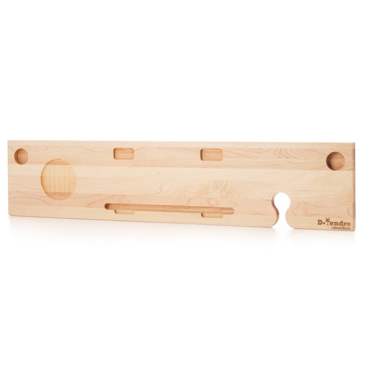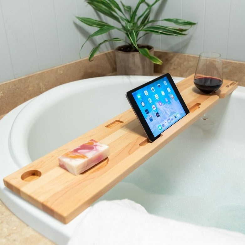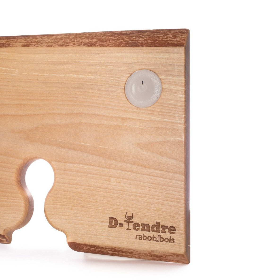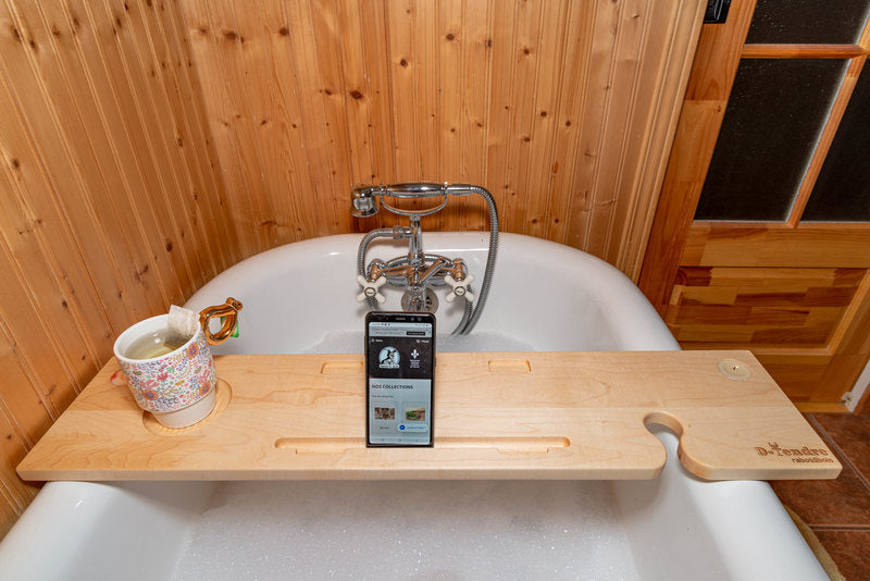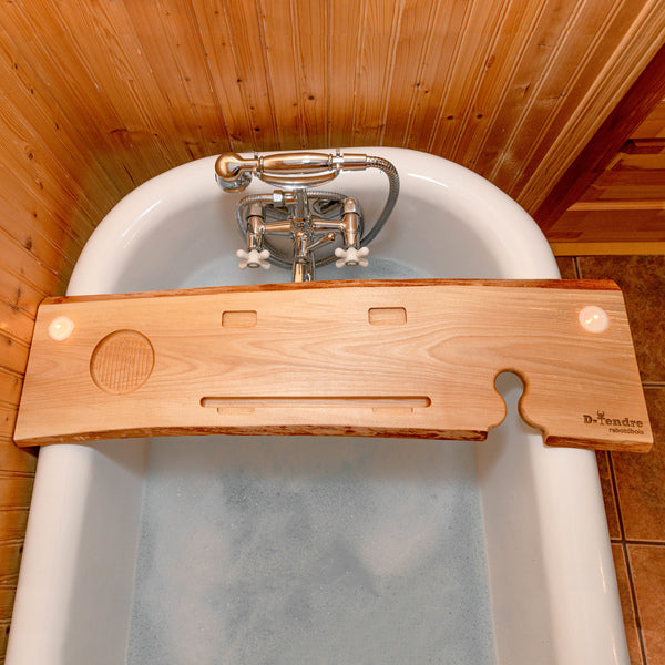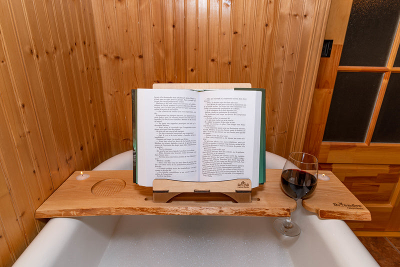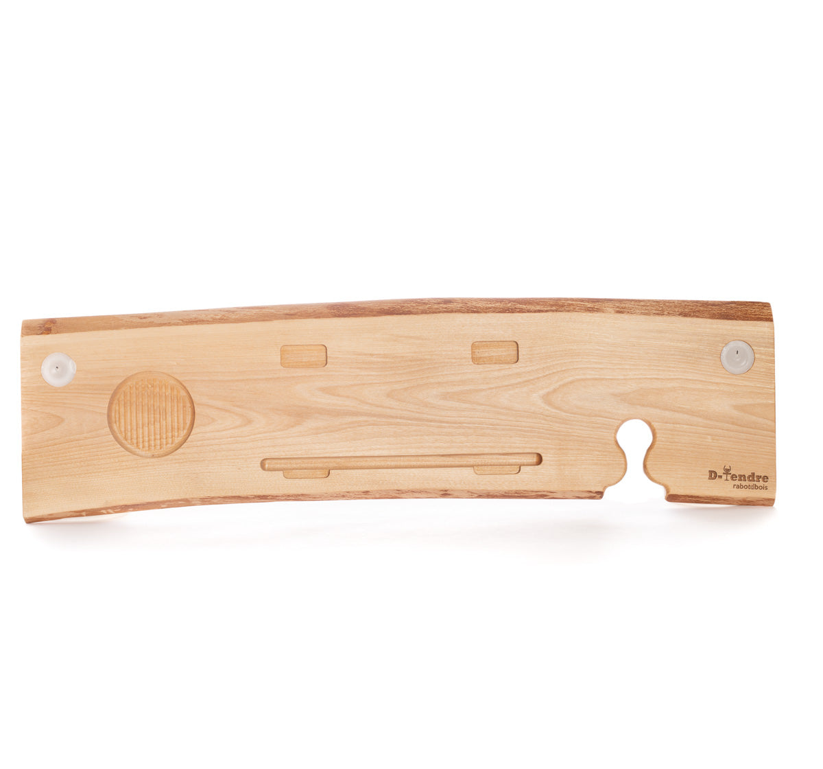 Tu apprécies prendre un bon bain chaud après une journée de travail? Nous avons l’accessoire parfait pour toi : le D-Tendre”, un pont de bain en bois qui te permettra de vaquer à tes occupations tout en relaxant. Cette planche de bain contient une rainure permettant de coincer ton cellulaire ou ta tablette électronique. Un espace a été conçu pour y déposer une tisane/bière. Deux espaces sont présents pour y déposer des lampions et une entaille est conçue pour sécuriser ta coupe de vin!