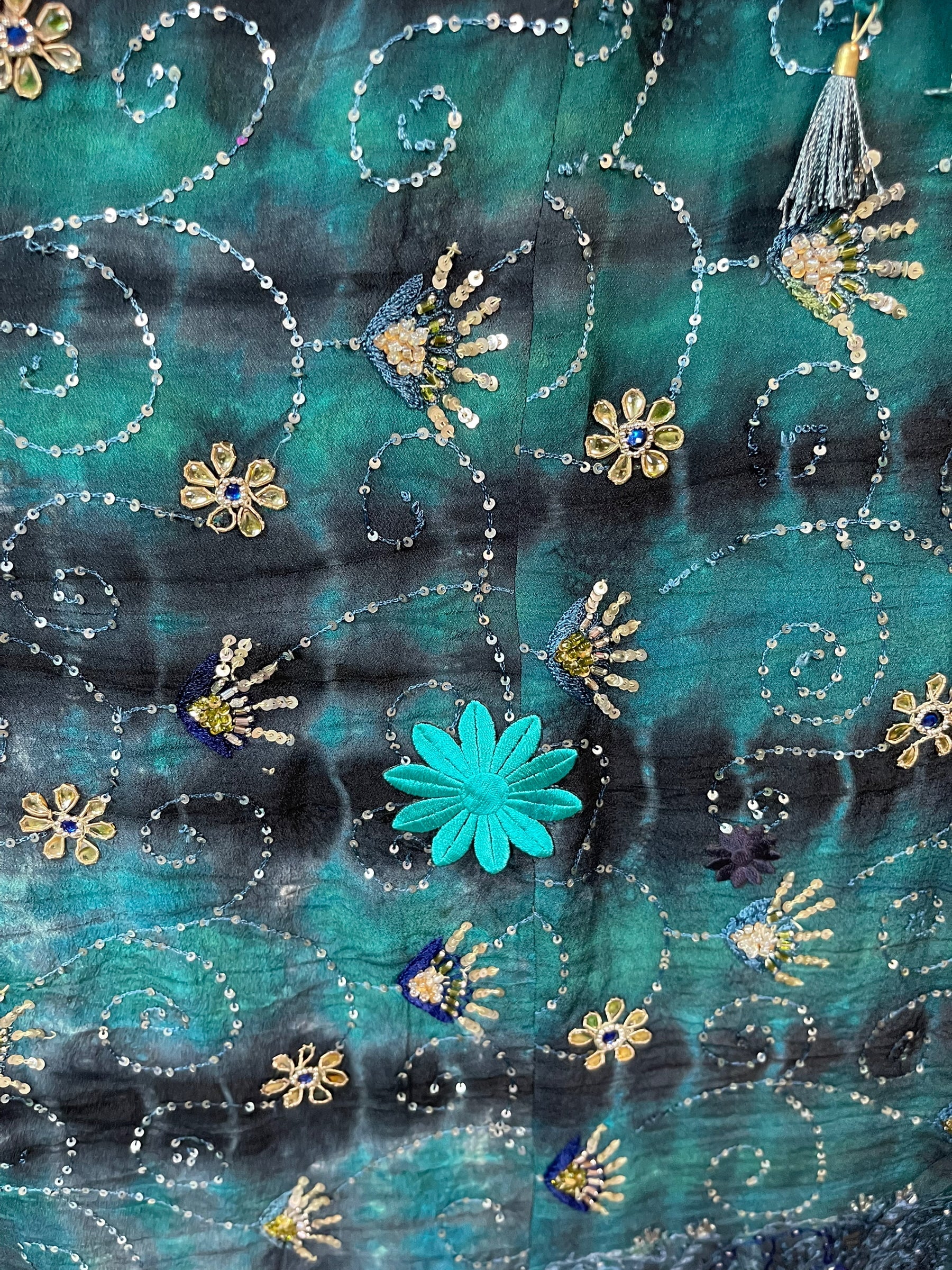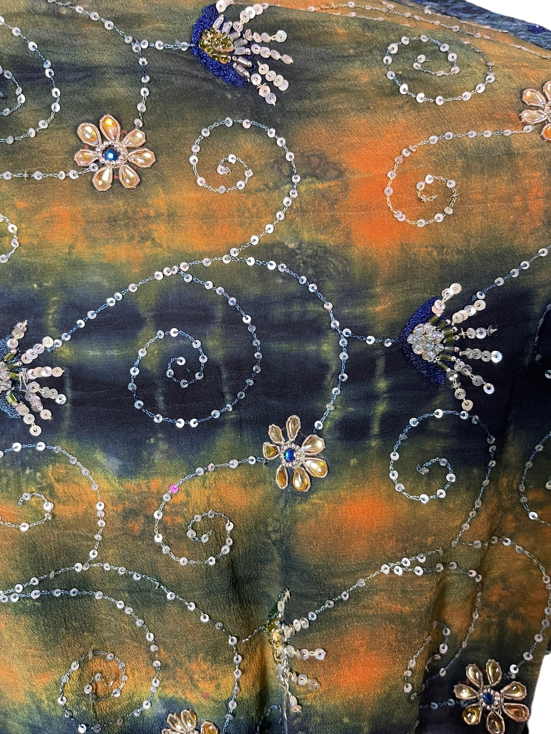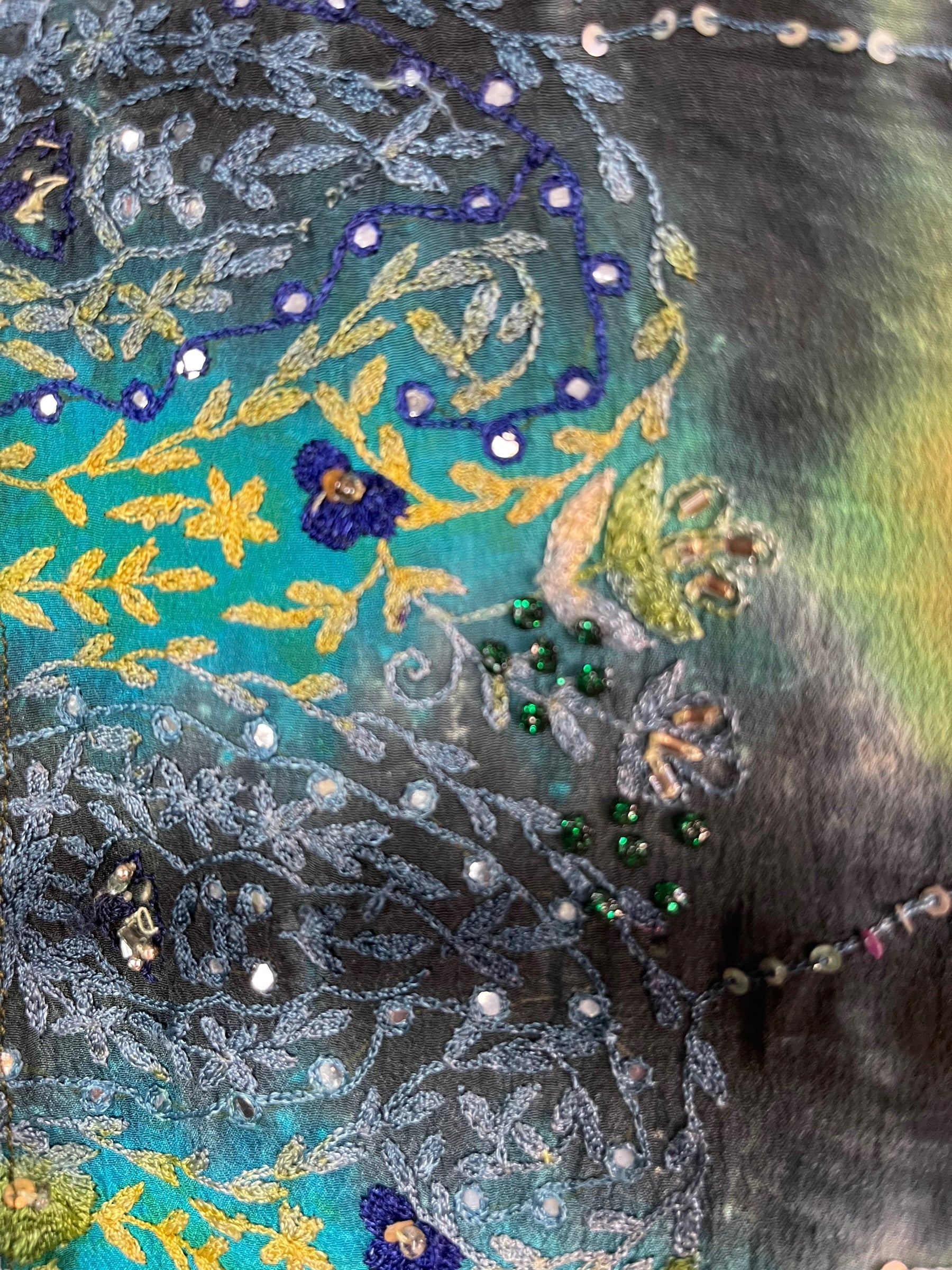In Eastern philosophy, an Avatar is an incarnation that teaches how to evolve virtues of the past into the present. The Pure Upcycled Silk Avatar Collection is made from vintage pure silk saris, chosen and worn by women in the past to celebrate their lives.If you look very closely, you will see that the silks in this collection show some of the character of their previous incarnations through the appliqués that have been lovingly applied to bring new life to the fabric. This piece is a reminder that we are part of a collective journey to which we all add a little something.