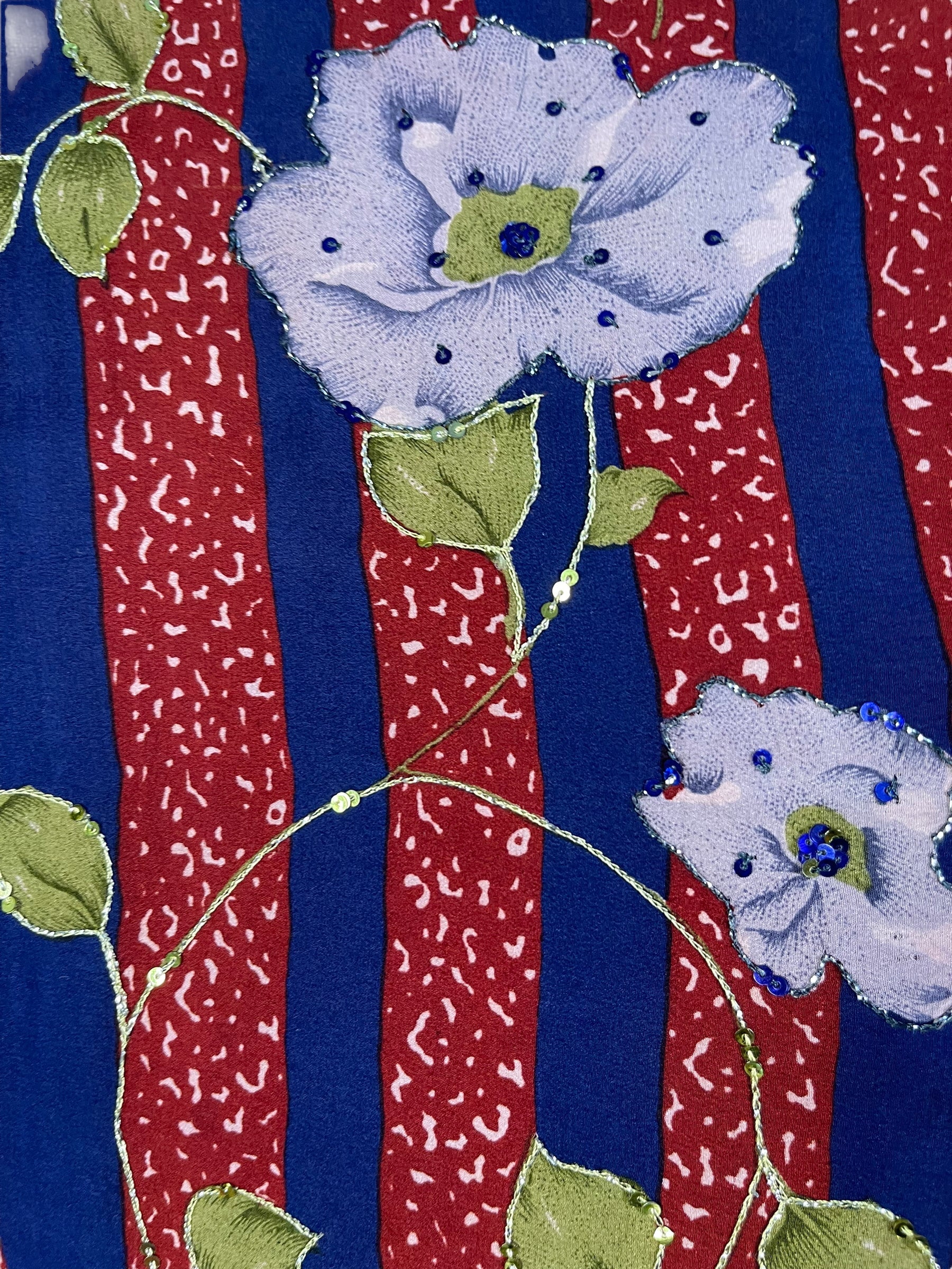 If you look very closely, you will see that the silks in this collection show some of the character of their previous incarnations through the appliqués that have been lovingly applied to bring new life to the fabric. This piece is a reminder that we are part of a collective journey to which we all add a little something.