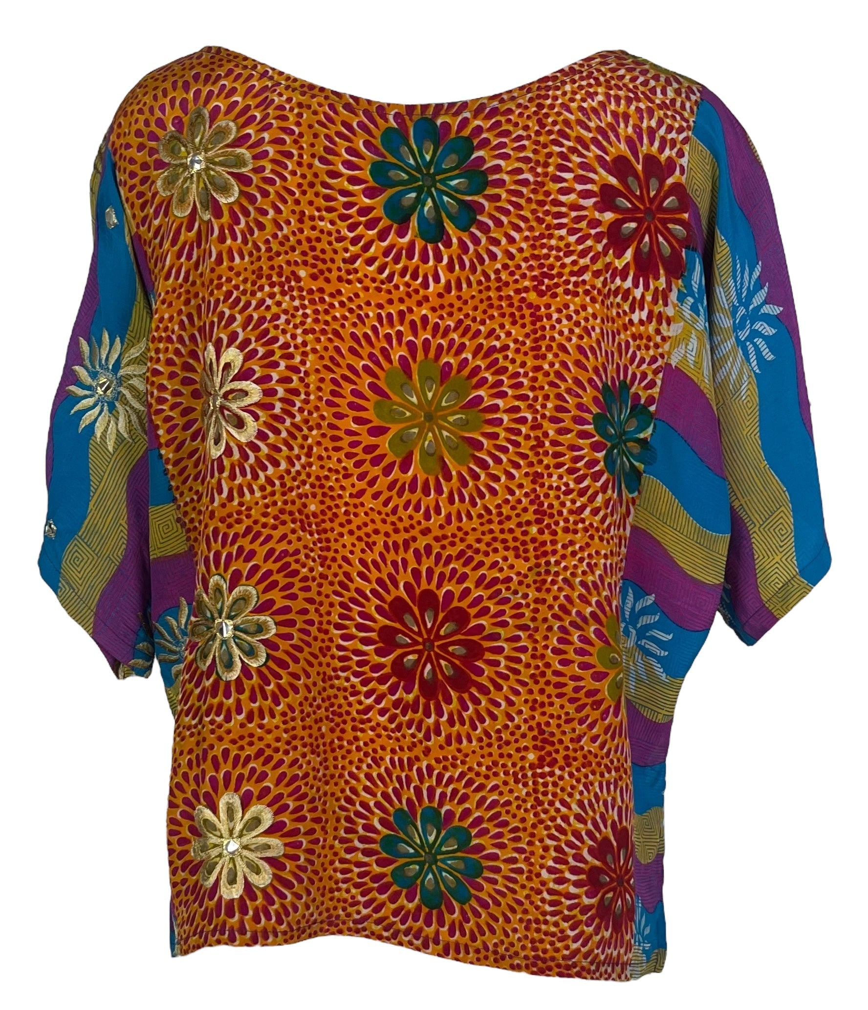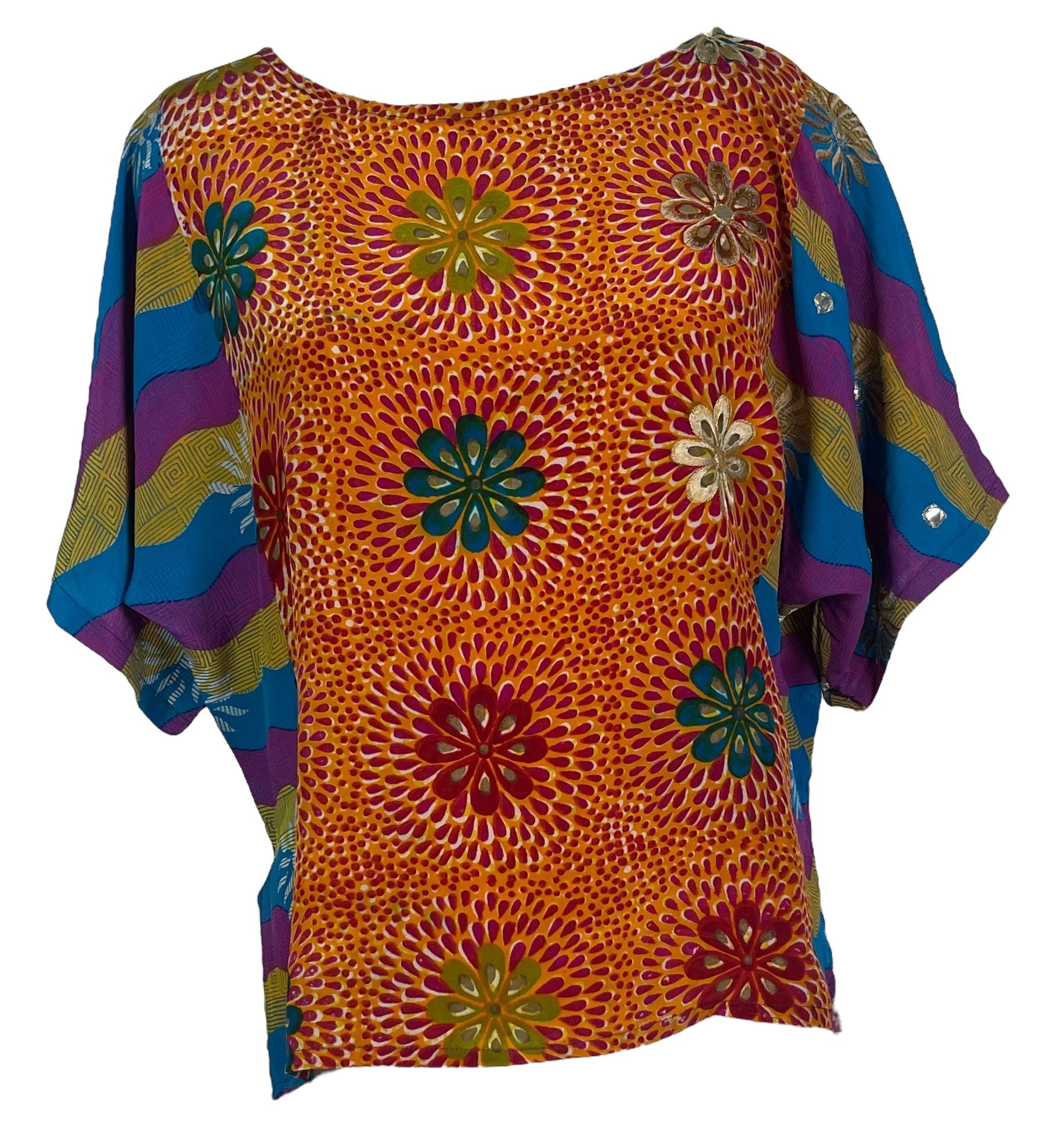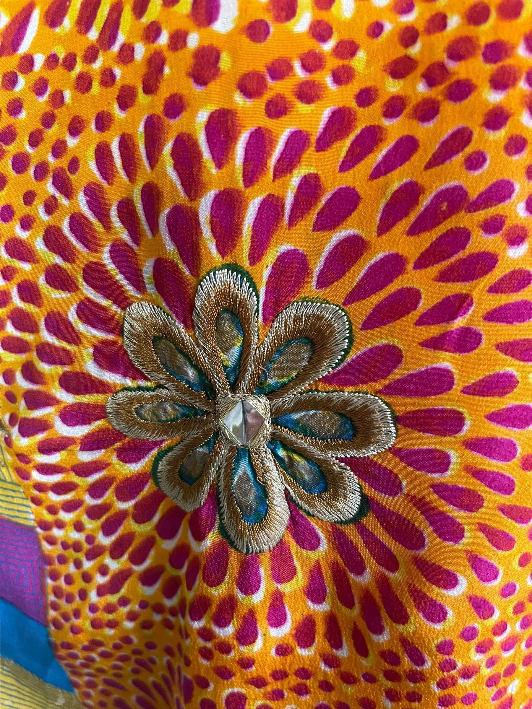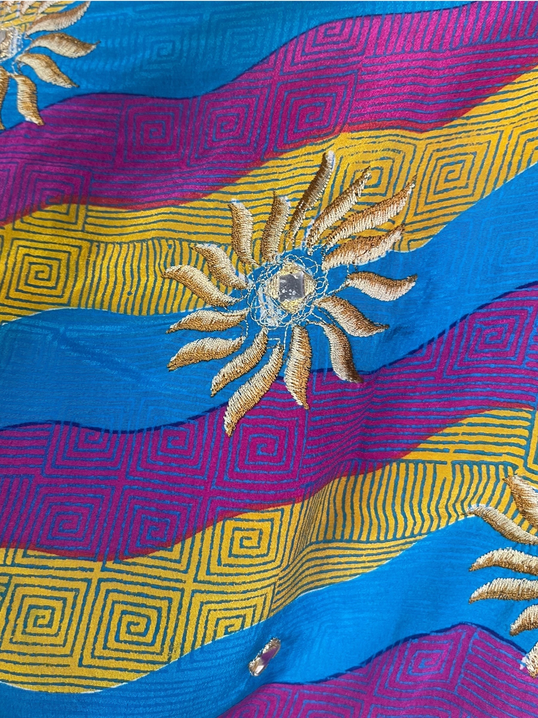 In Eastern philosophy, an Avatar is an incarnation that teaches how to evolve virtues of the past into the present. The Pure Upcycled Silk Avatar Collection is made from vintage pure silk saris, chosen and worn by women in the past to celebrate their lives.If you look very closely, you will see that the silks in this collection show some of the character of their previous incarnations through the appliqués that have been lovingly applied to bring new life to the fabric. This piece is a reminder that we are part of a collective journey to which we all add a little something.