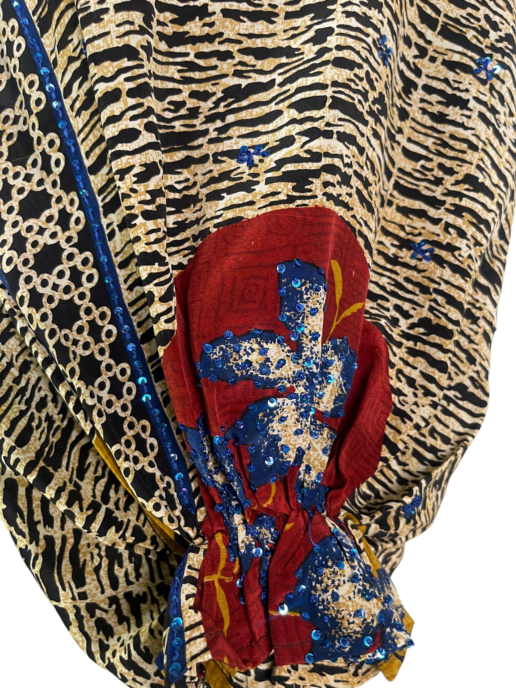 In Eastern philosophy, an Avatar is an incarnation that teaches how to evolve virtues of the past into the present. The Pure Upcycled Silk Avatar Collection is made from vintage pure silk saris, chosen and worn by women in the past to celebrate their lives.If you look very closely, you will see that the silks in this collection show some of the character of their previous incarnations through the appliqués that have been lovingly applied to bring new life to the fabric. This piece is a reminder that we are part of a collective journey to which we all add a little something.