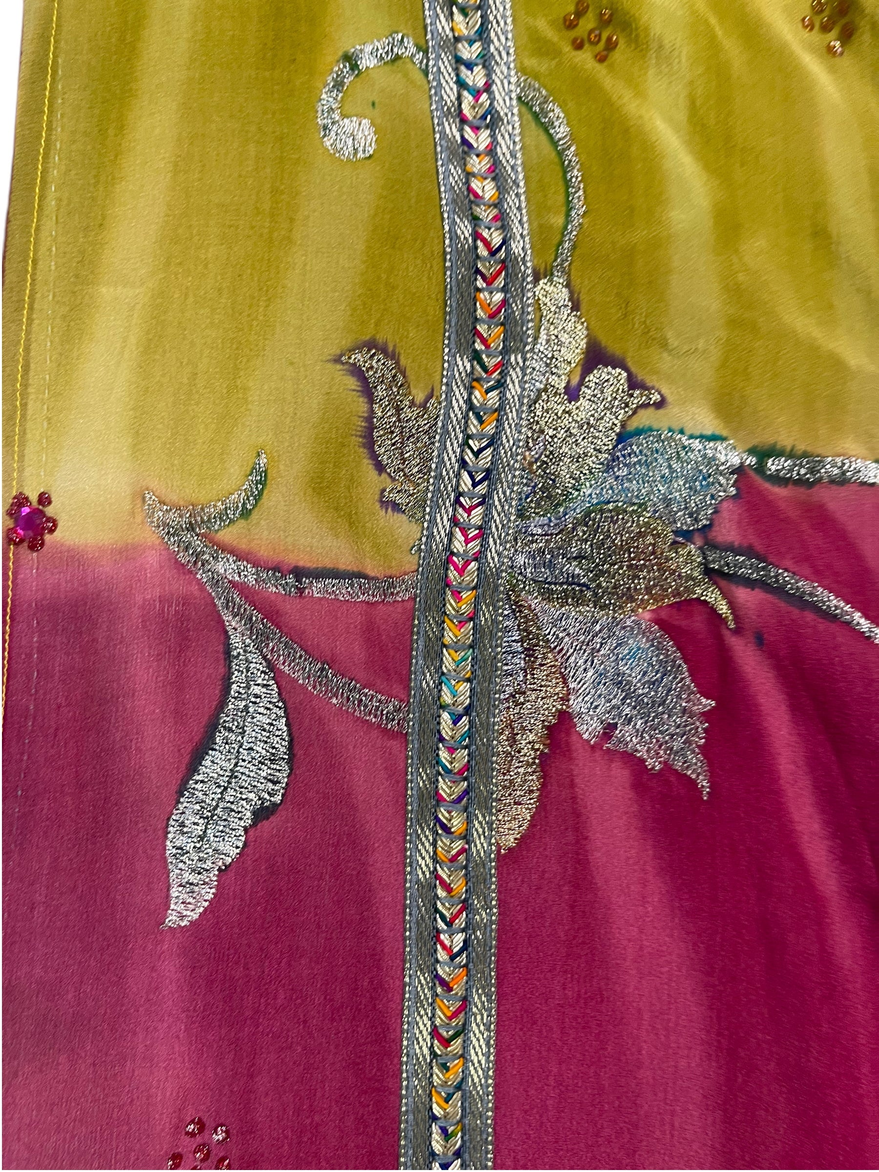 In Eastern philosophy, an Avatar is an incarnation that teaches how to evolve virtues of the past into the present. The Pure Upcycled Silk Avatar Collection is made from vintage pure silk saris, chosen and worn by women in the past to celebrate their lives.If you look very closely, you will see that the silks in this collection show some of the character of their previous incarnations through the appliqués that have been lovingly applied to bring new life to the fabric. This piece is a reminder that we are part of a collective journey to which we all add a little something.