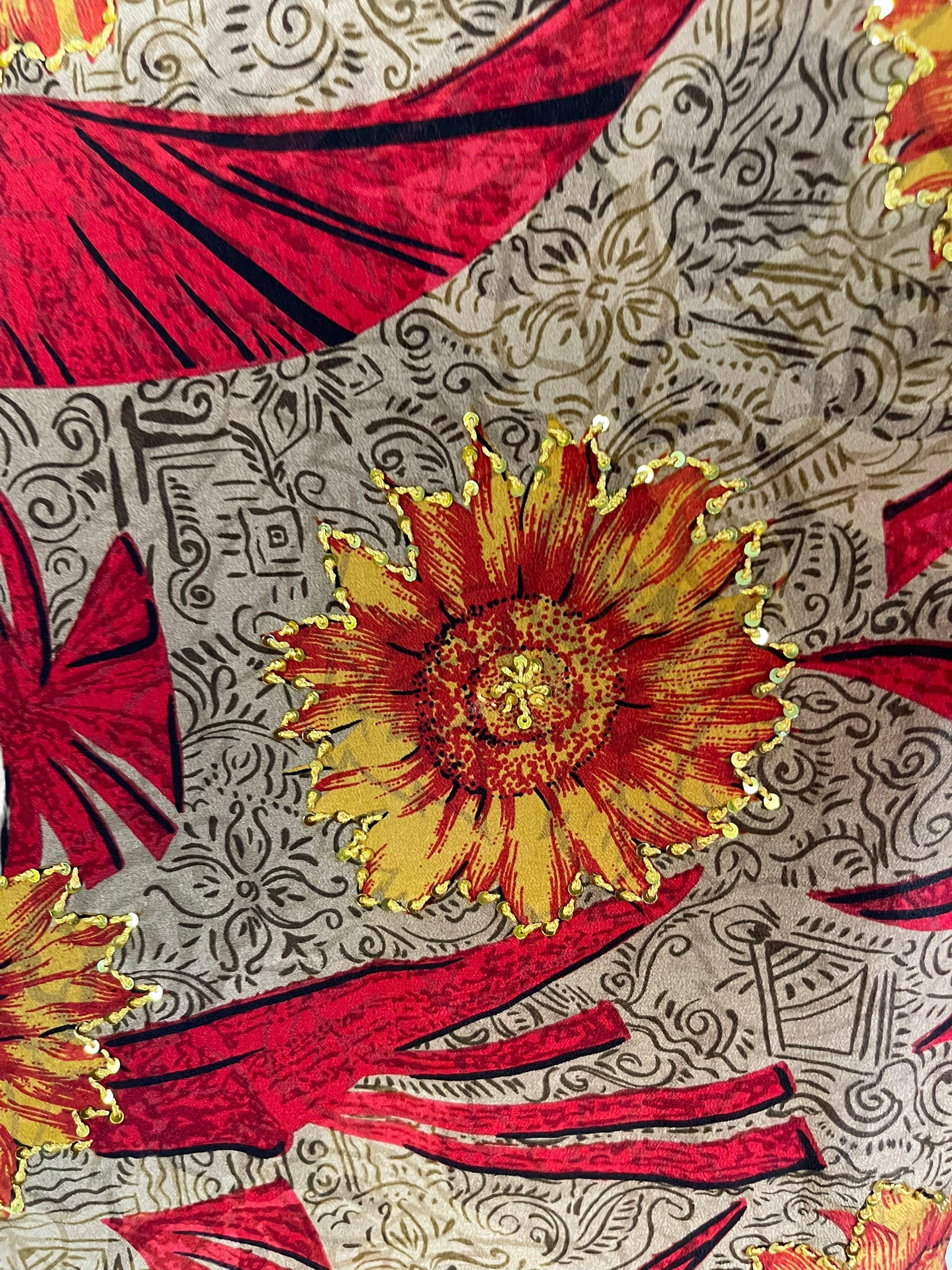 If you look very closely, you will see that the silks in this collection show some of the character of their previous incarnations through the appliqués that have been lovingly applied to bring new life to the fabric. This piece is a reminder that we are part of a collective journey to which we all add a little something.