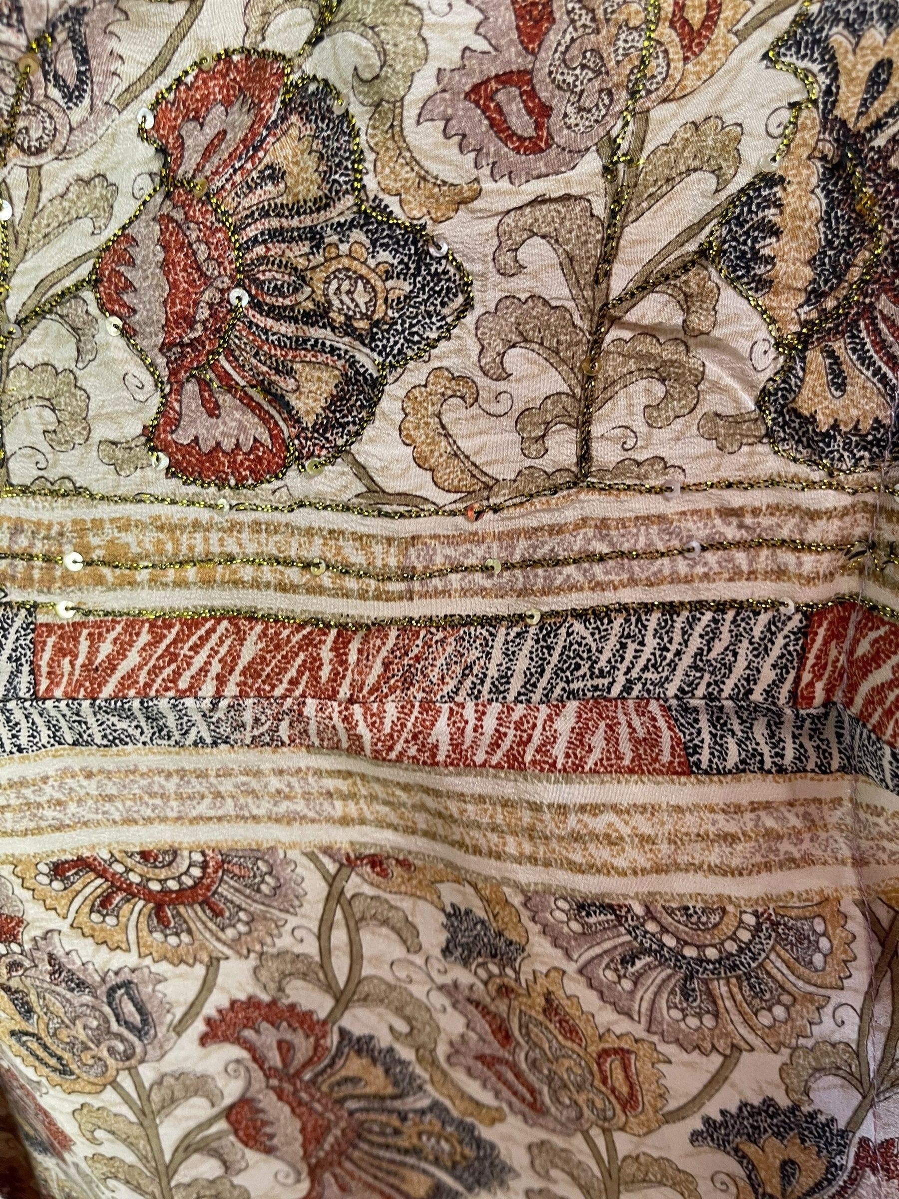 In Eastern philosophy, an Avatar is an incarnation that teaches how to evolve virtues of the past into the present. The Pure Upcycled Silk Avatar Collection is made from vintage pure silk saris, chosen and worn by women in the past to celebrate their lives.If you look very closely, you will see that the silks in this collection show some of the character of their previous incarnations through the appliqués that have been lovingly applied to bring new life to the fabric. This piece is a reminder that we are part of a collective journey to which we all add a little something.