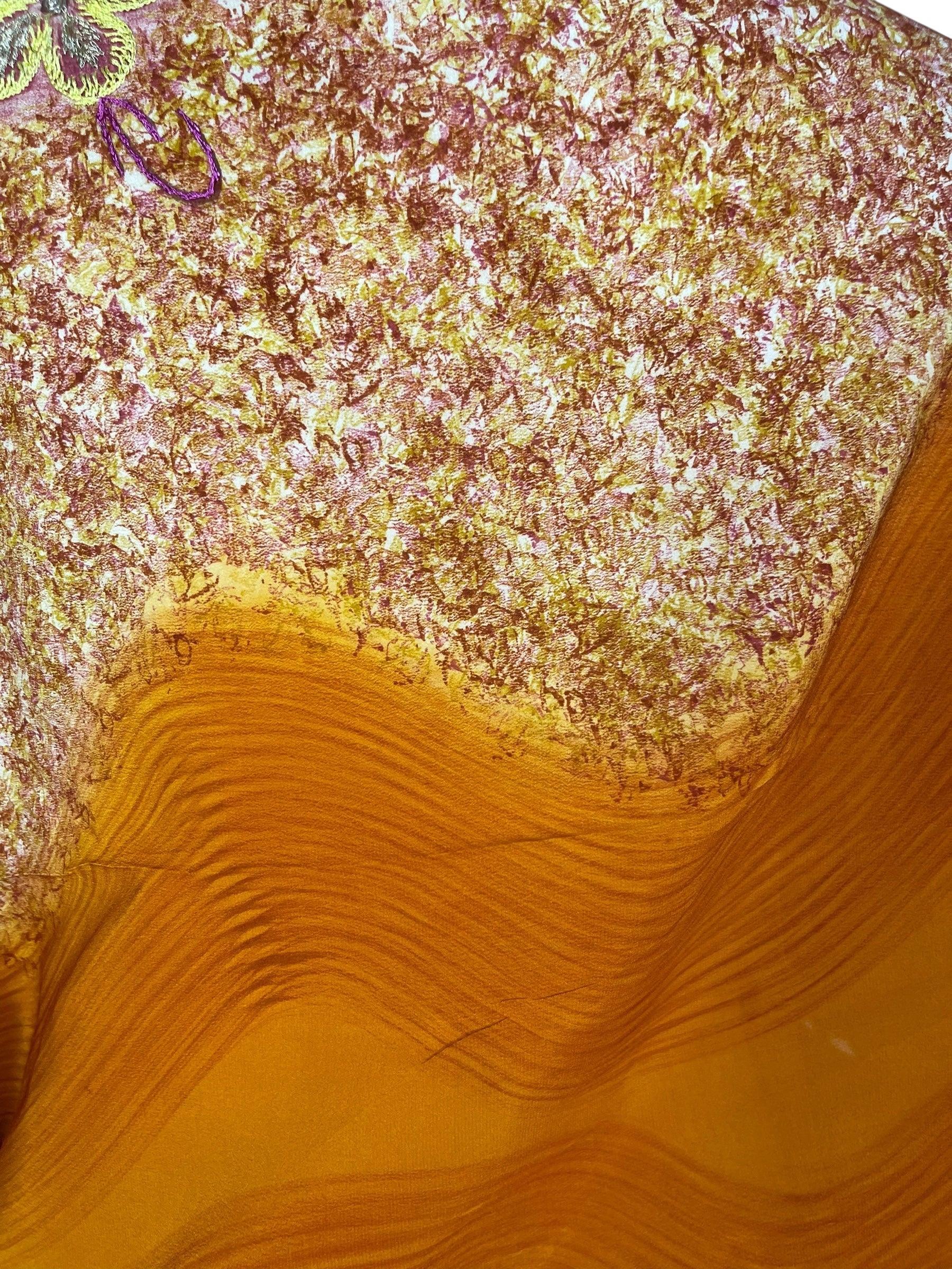 In Eastern philosophy, an Avatar is an incarnation that teaches how to evolve virtues of the past into the present. The Pure Upcycled Silk Avatar Collection is made from vintage pure silk saris, chosen and worn by women in the past to celebrate their lives.If you look very closely, you will see that the silks in this collection show some of the character of their previous incarnations through the appliqués that have been lovingly applied to bring new life to the fabric. This piece is a reminder that we are part of a collective journey to which we all add a little something.