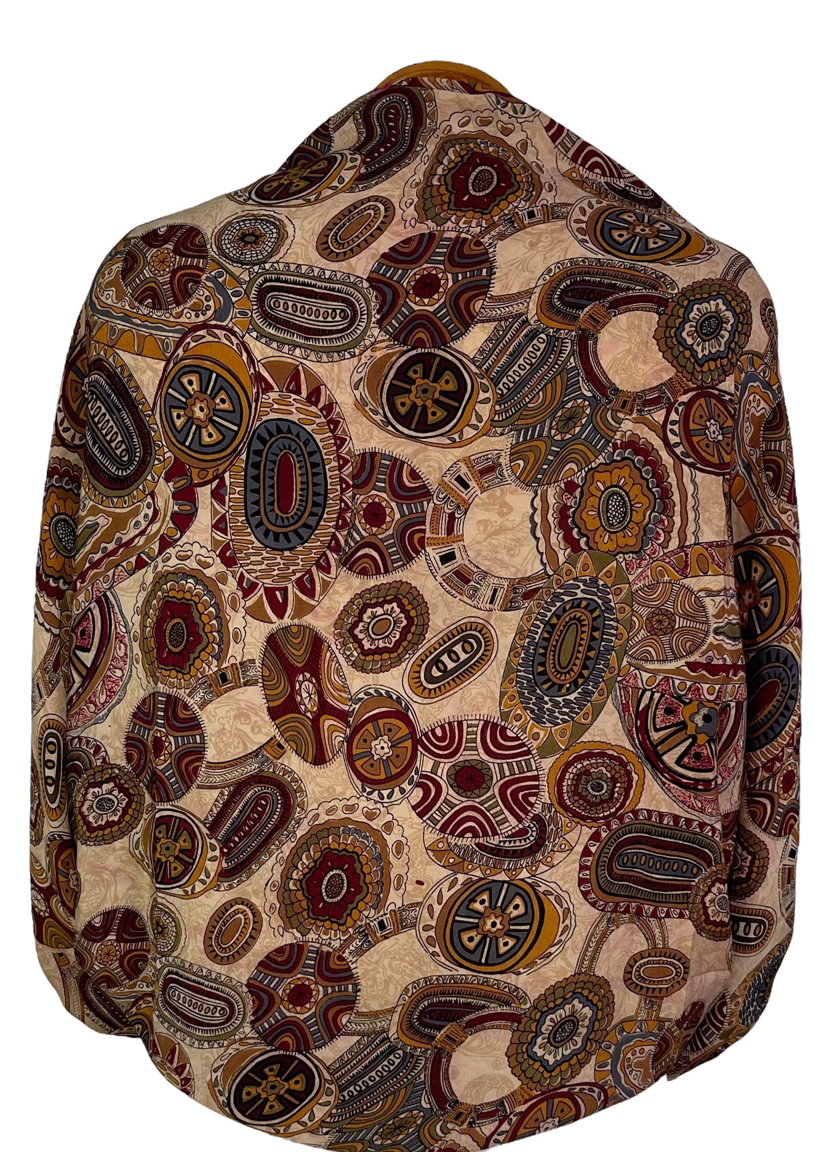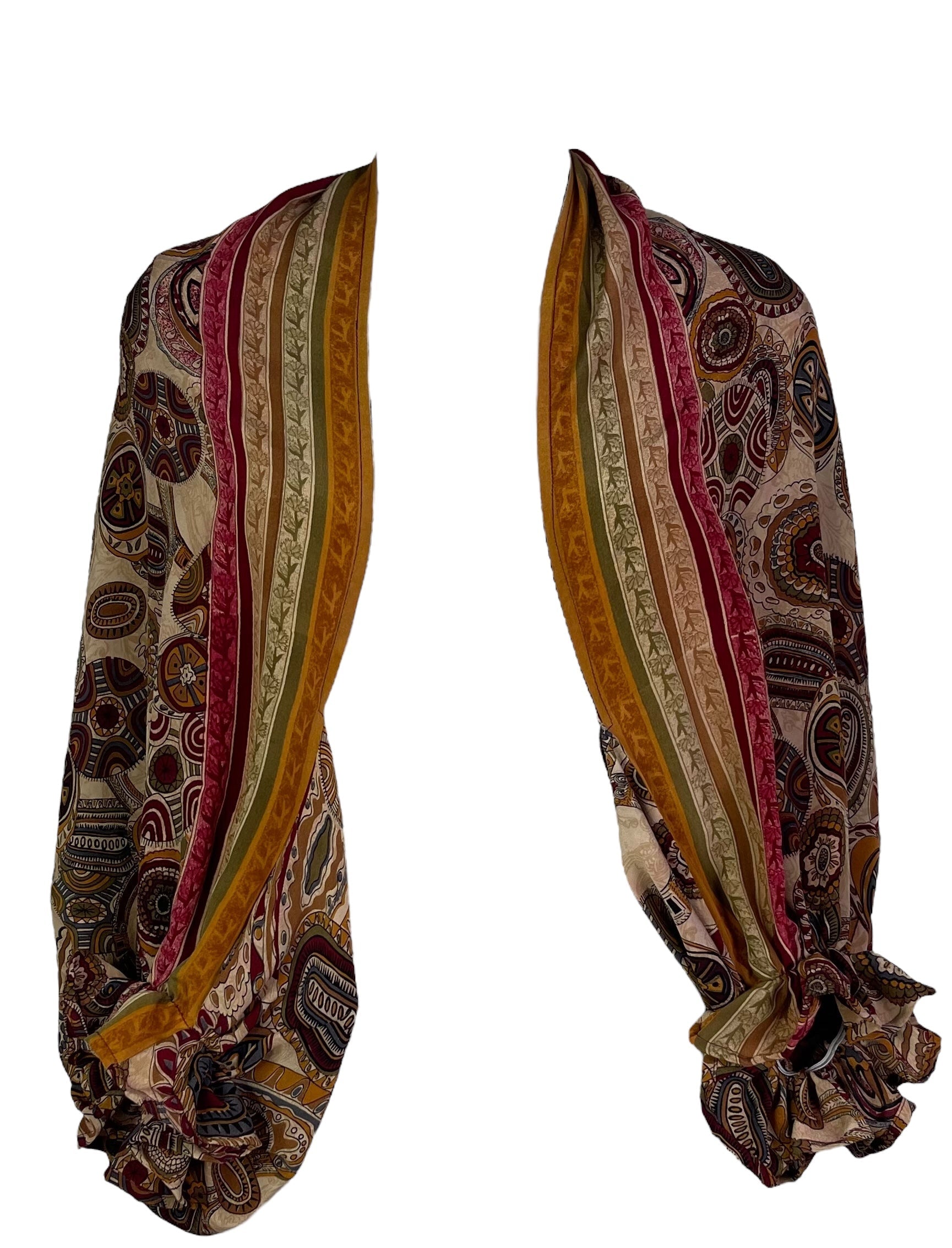 Introducing our exquisite Pure Silk Bolero, a one-of-a-kind accessory designed to elevate your style and provide ultimate convenience. Crafted from luxurious upcycled pure silk saris, this bolero is perfect for covering your arms and shoulders, adding a touch of elegance to any outfit.