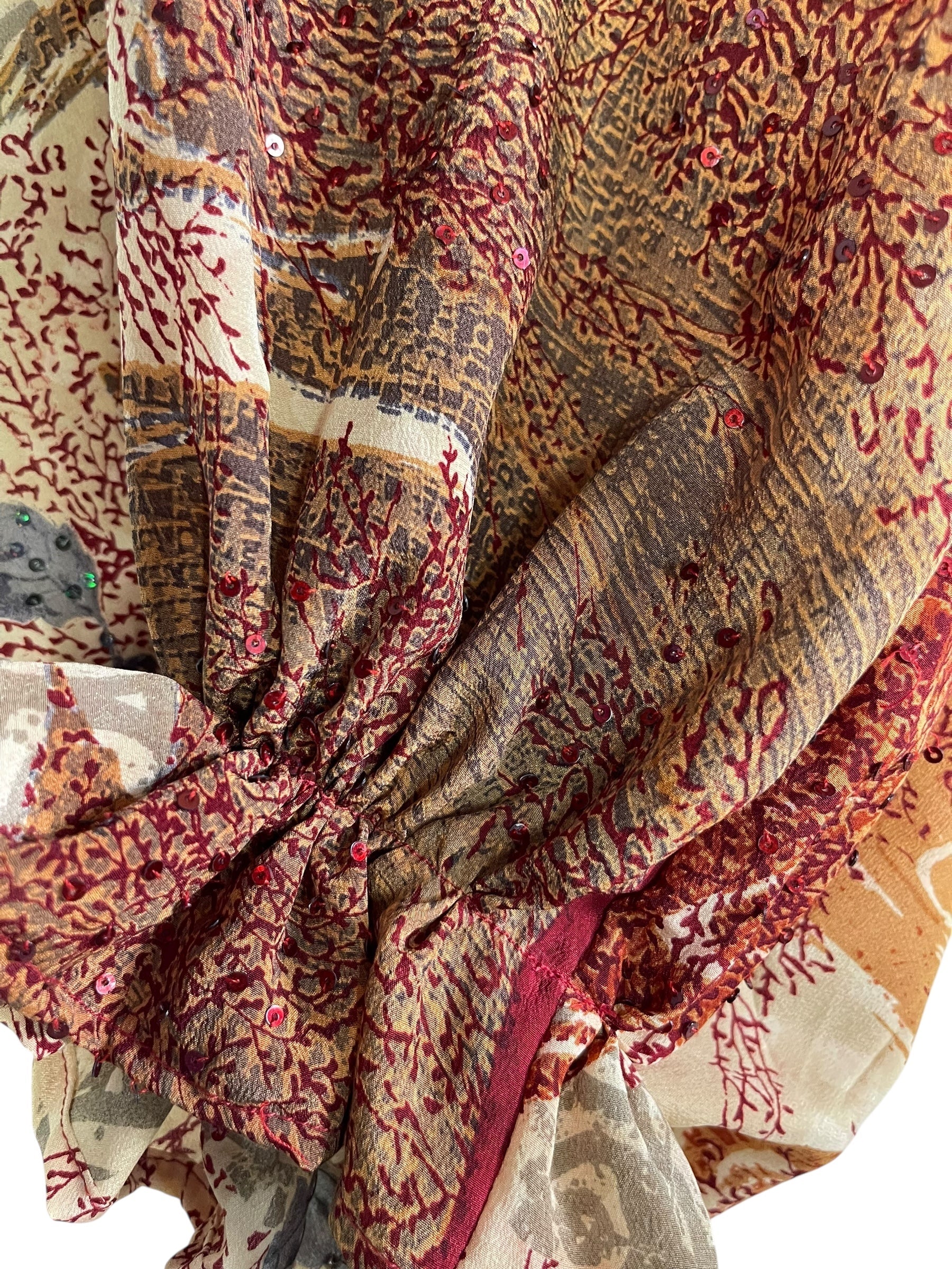 In Eastern philosophy, an Avatar is an incarnation that teaches how to evolve virtues of the past into the present. The Pure Upcycled Silk Avatar Collection is made from vintage pure silk saris, chosen and worn by women in the past to celebrate their lives.If you look very closely, you will see that the silks in this collection show some of the character of their previous incarnations through the appliqués that have been lovingly applied to bring new life to the fabric. This piece is a reminder that we are part of a collective journey to which we all add a little something.
