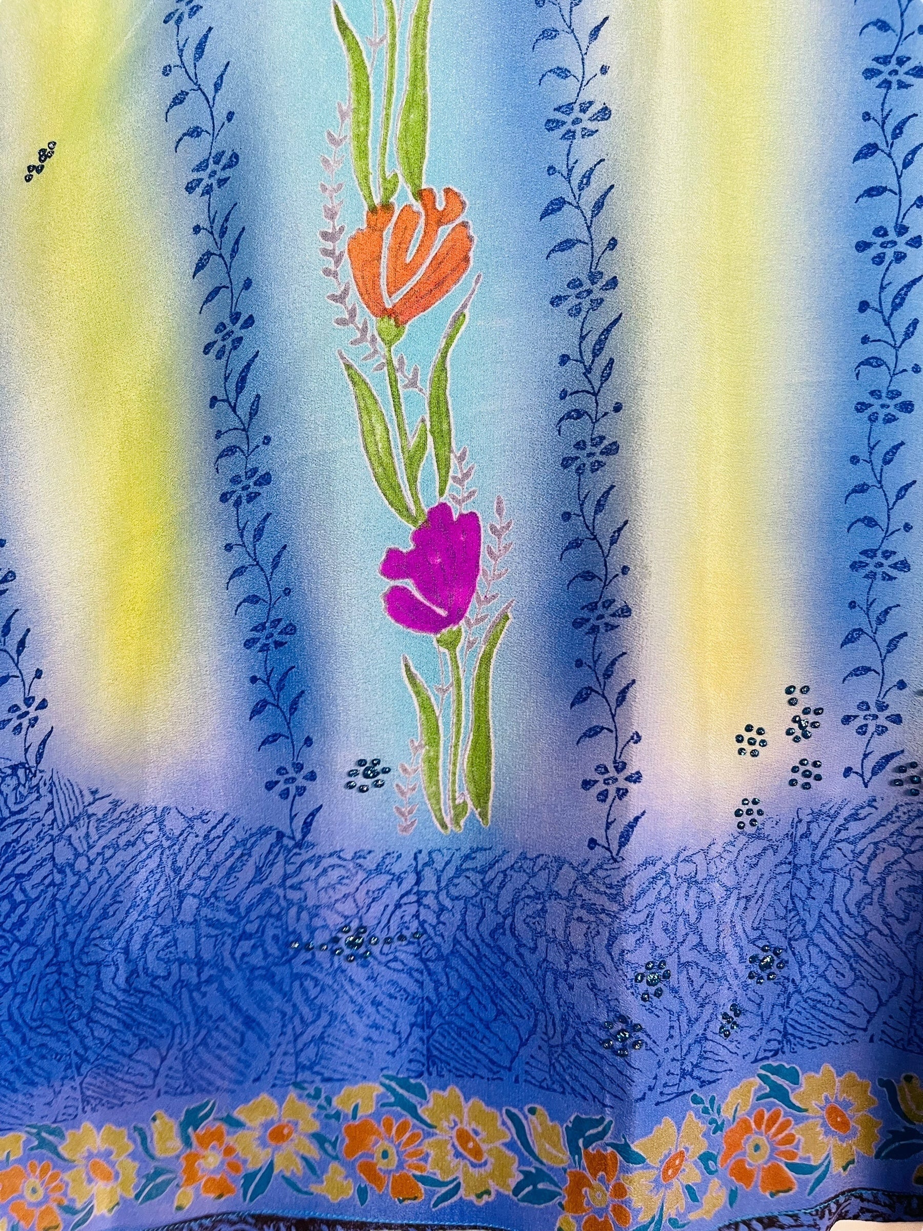 In Eastern philosophy, an Avatar is an incarnation that teaches how to evolve virtues of the past into the present. The Pure Upcycled Silk Avatar Collection is made from vintage pure silk saris, chosen and worn by women in the past to celebrate their lives.If you look very closely, you will see that the silks in this collection show some of the character of their previous incarnations through the appliqués that have been lovingly applied to bring new life to the fabric. This piece is a reminder that we are part of a collective journey to which we all add a little something.
