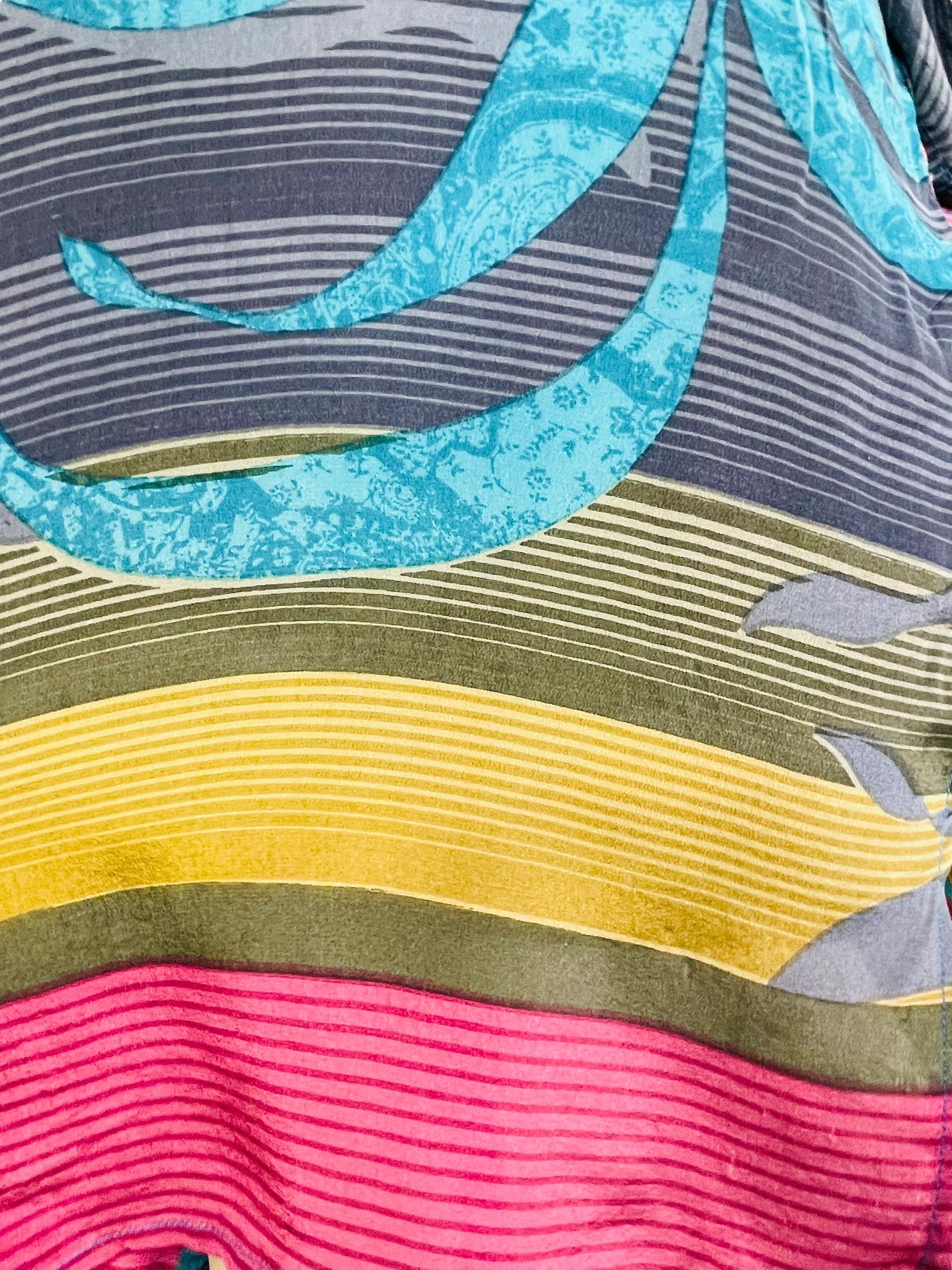 In Eastern philosophy, an Avatar is an incarnation that teaches how to evolve virtues of the past into the present. The Pure Upcycled Silk Avatar Collection is made from vintage pure silk saris, chosen and worn by women in the past to celebrate their lives.If you look very closely, you will see that the silks in this collection show some of the character of their previous incarnations through the appliqués that have been lovingly applied to bring new life to the fabric. This piece is a reminder that we are part of a collective journey to which we all add a little something.