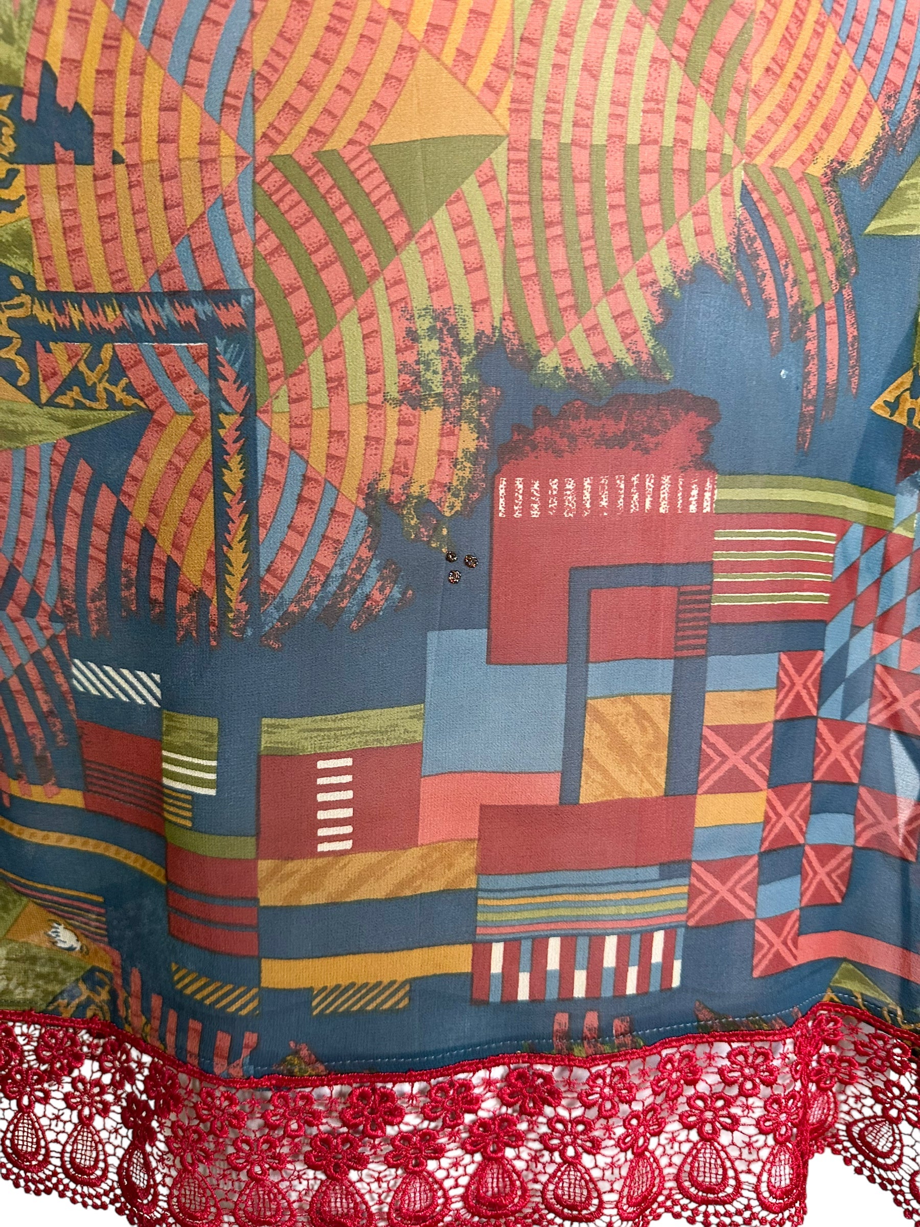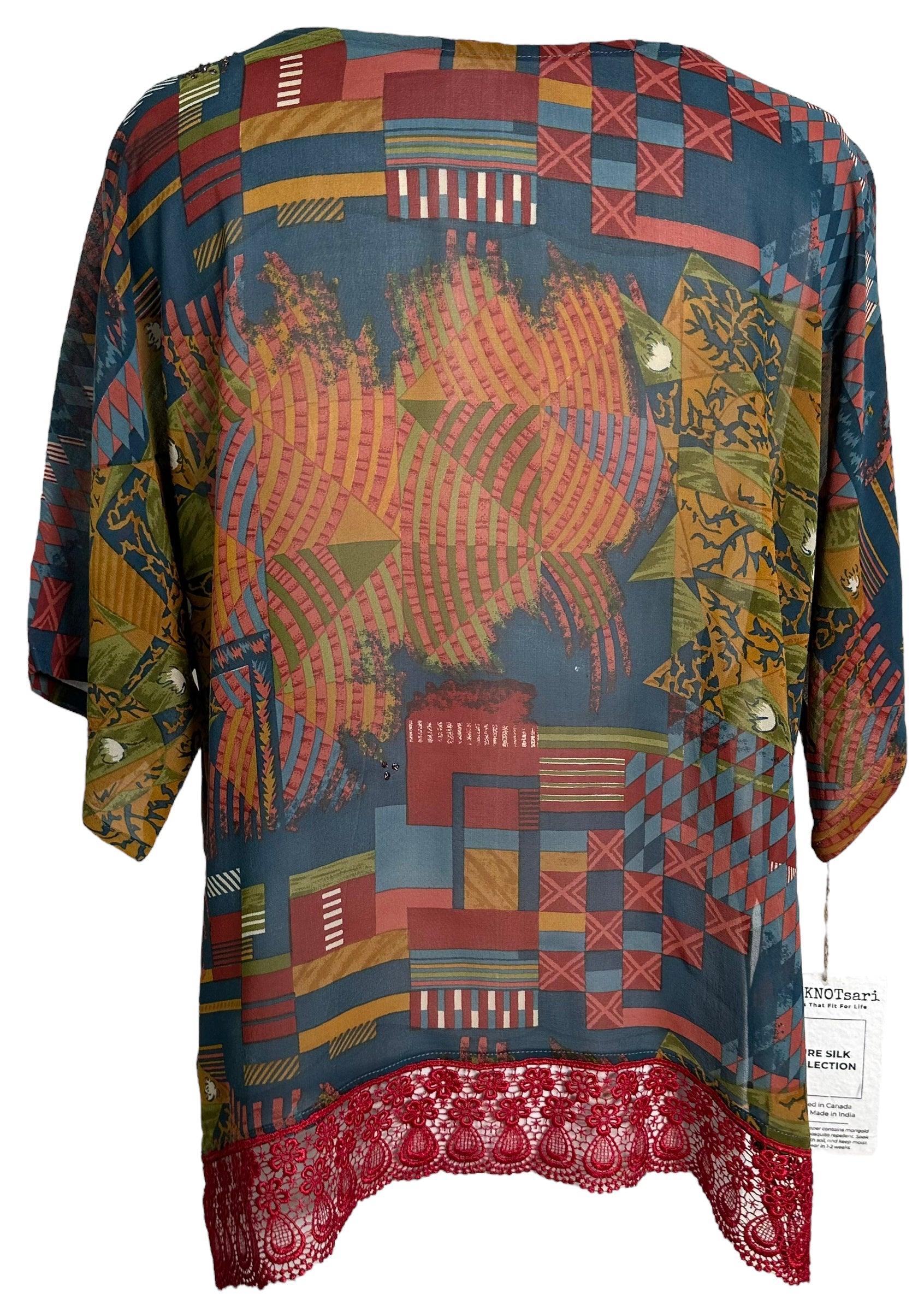In Eastern philosophy, an Avatar is an incarnation that teaches how to evolve virtues of the past into the present. The Pure Upcycled Silk Avatar Collection is made from vintage pure silk saris, chosen and worn by women in the past to celebrate their lives.If you look very closely, you will see that the silks in this collection show some of the character of their previous incarnations through the appliqués that have been lovingly applied to bring new life to the fabric. This piece is a reminder that we are part of a collective journey to which we all add a little something.