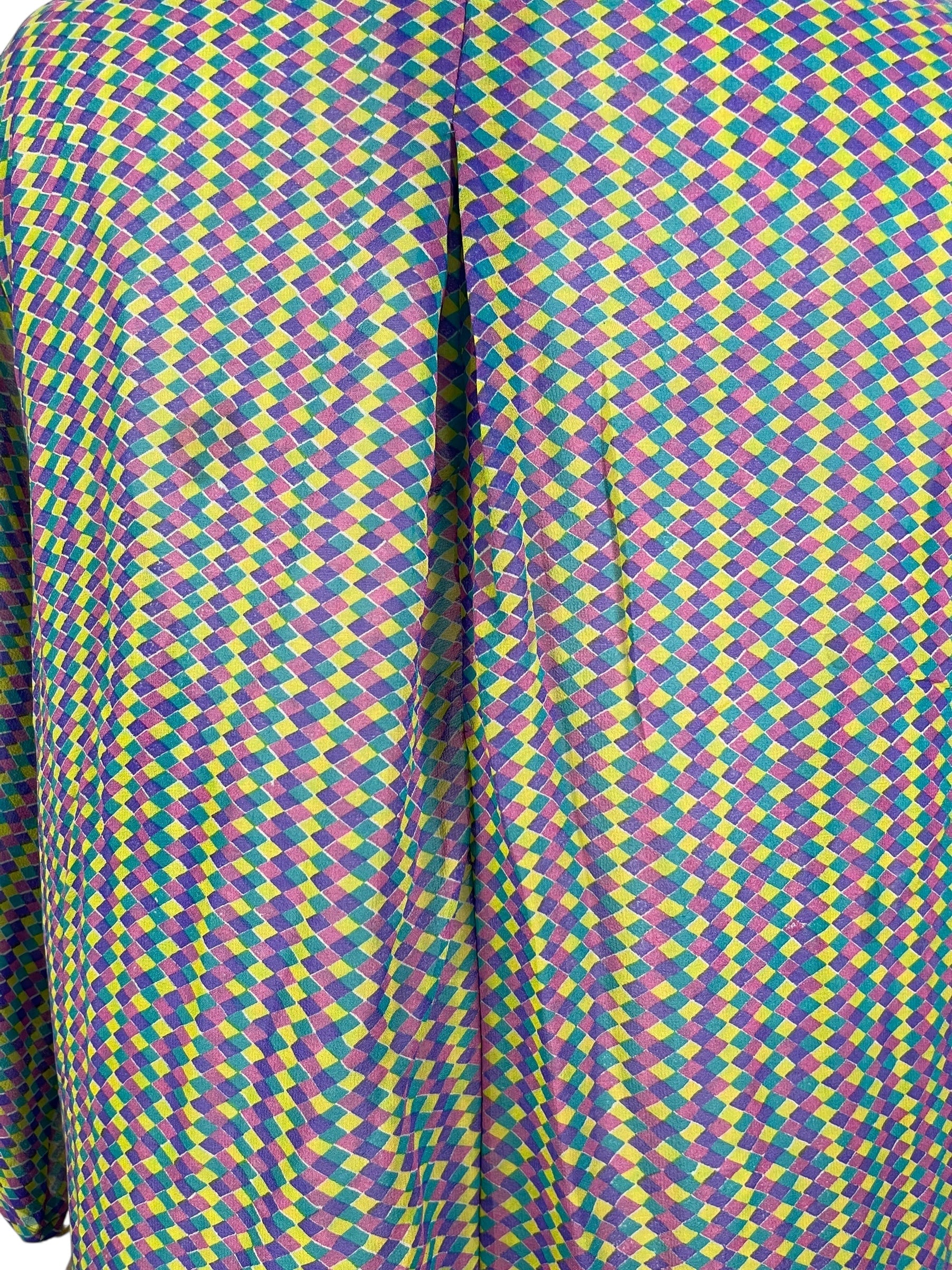 Customers are drawn to the unique, asymmetrical hemline and sculptural self-pocket design of this tunic, available in a multitude of colors and patterns. Crafted of upcycled crepe or georgette silk for supreme comfort and a flattering fit, this piece features a generous cut that fits most sizes. Confirm exact measurements on the Video tab below and explore styling tips with the accompanying video.