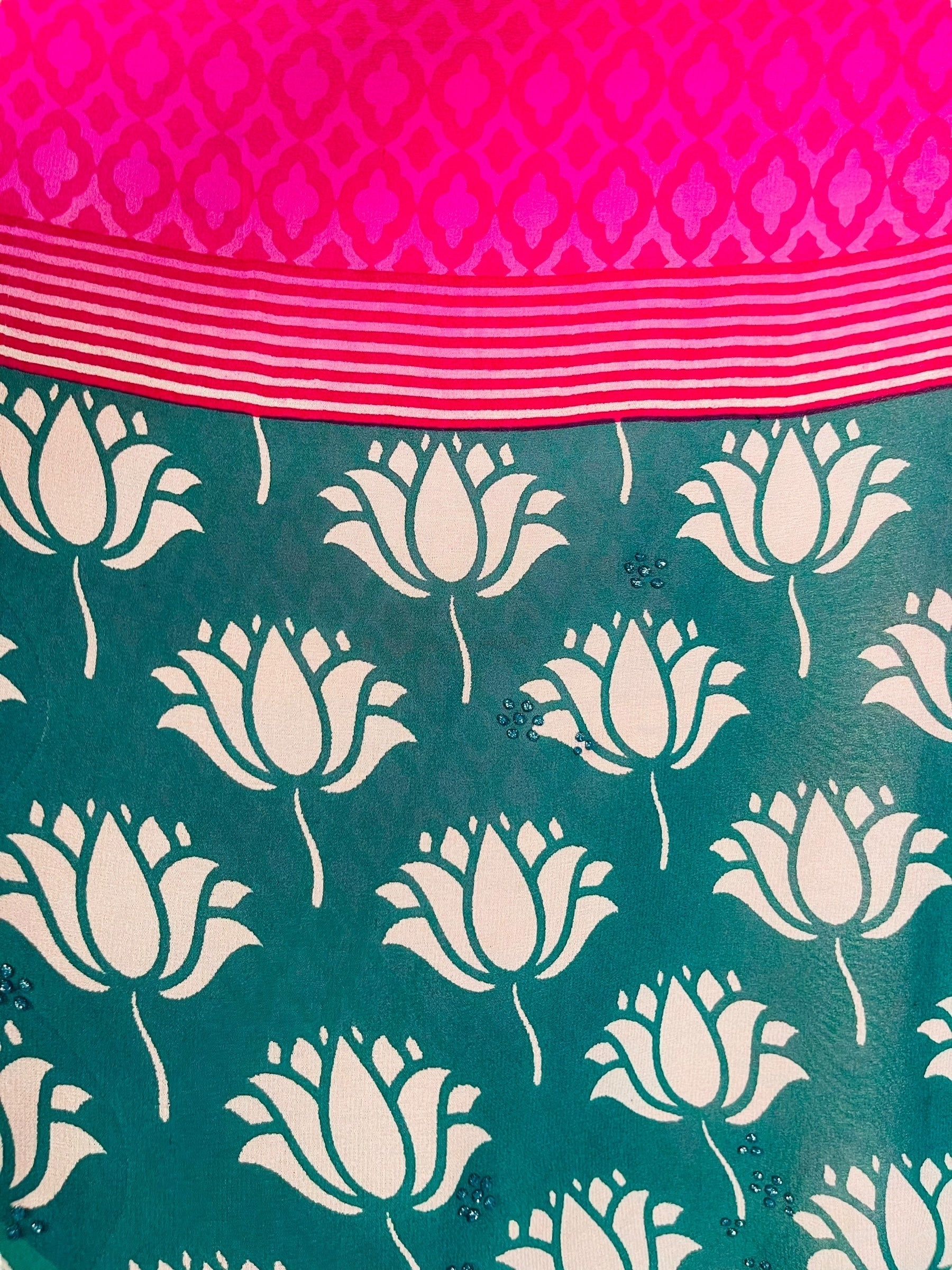 In Eastern philosophy, an Avatar is an incarnation that teaches how to evolve virtues of the past into the present. The Pure Upcycled Silk Avatar Collection is made from vintage pure silk saris, chosen and worn by women in the past to celebrate their lives.If you look very closely, you will see that the silks in this collection show some of the character of their previous incarnations through the appliqués that have been lovingly applied to bring new life to the fabric. This piece is a reminder that we are part of a collective journey to which we all add a little something.