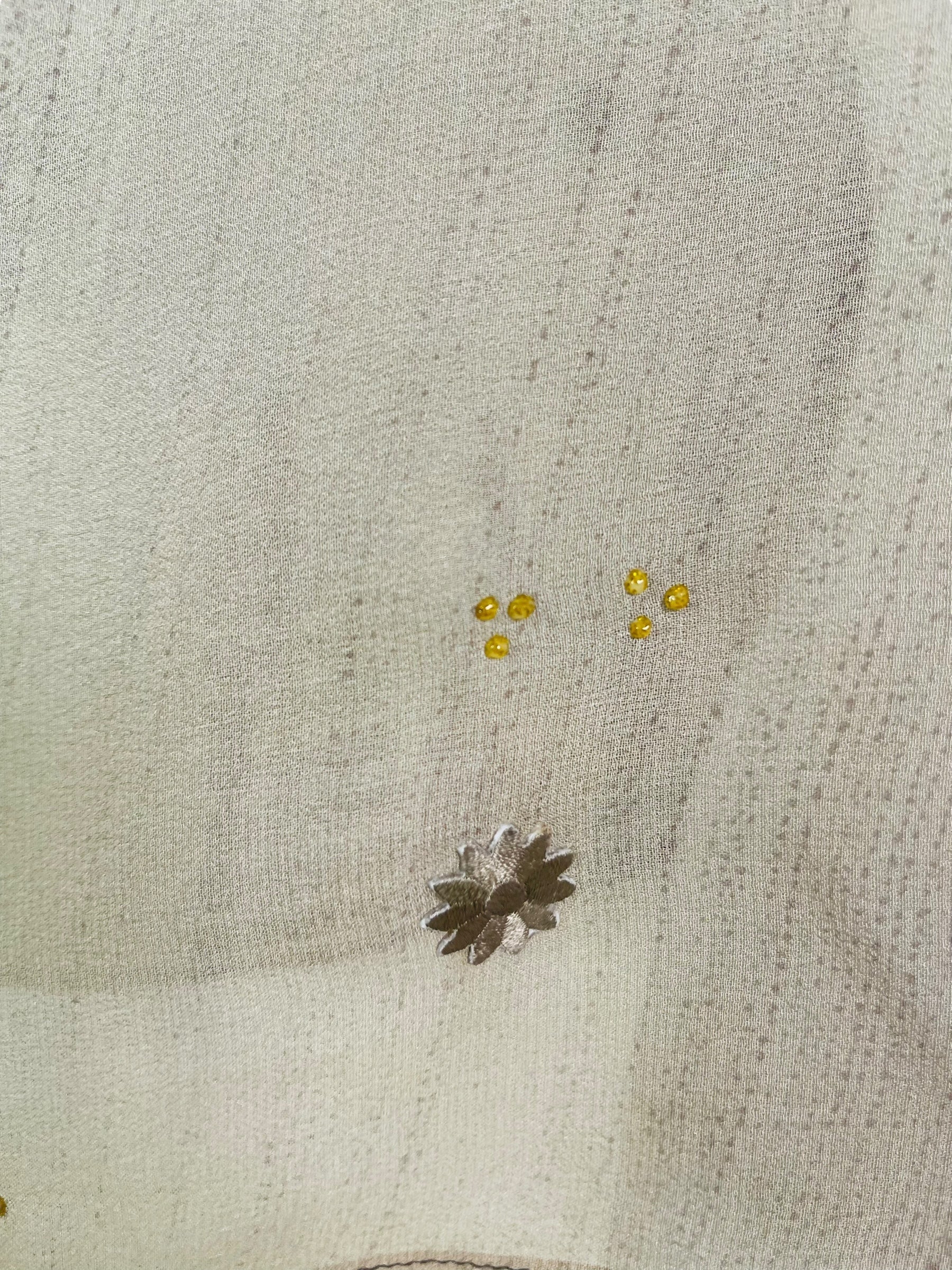 If you look very closely, you will see that the silks in this collection show some of the character of their previous incarnations through the appliqués that have been lovingly applied to bring new life to the fabric. This piece is a reminder that we are part of a collective journey to which we all add a little something.