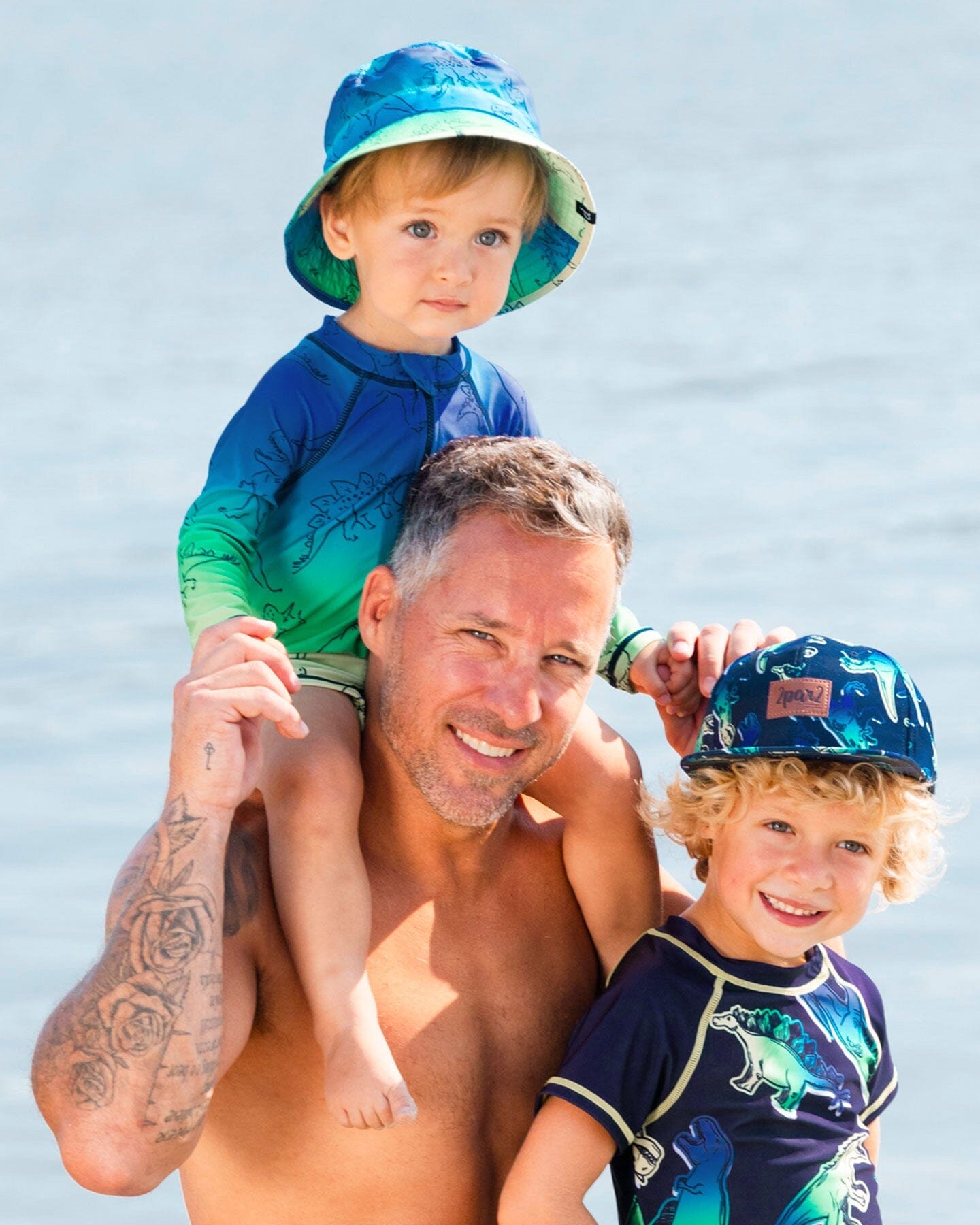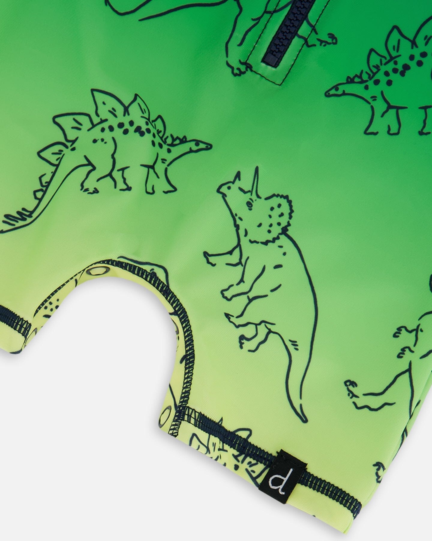 With long sleeves for maximum protection, our Printed Long Sleeve One-Piece Rashguard Vibrant Blue and Green Dino is a must-have for the spring and summer seasons. This one-piece swimsuit offers UPF 50+ sun protection and features long raglan sleeves, a round neckline, a half zipper closure, and a gradient print with allover dinosaurs.