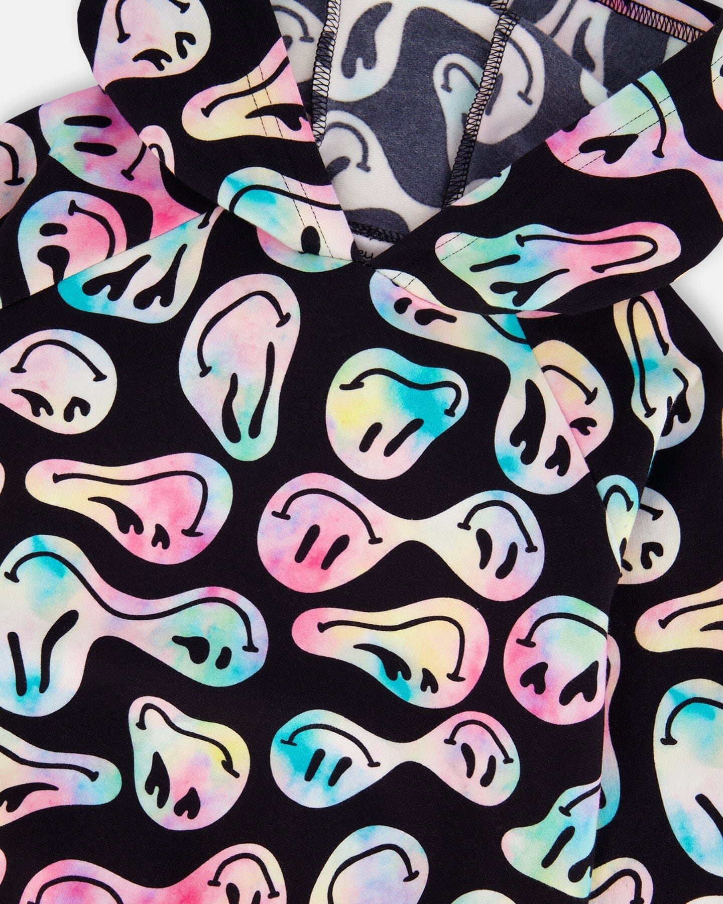 Colorful, cozy, and oh-so-cool, this fleece sweatshirt adds instant style to any little one's wardrobe! Ultra-comfy in stretch cotton fleece, this hoodie features an easy pullover silhouette with long raglan sleeves, stretchy cuffs and a stretch bottom hem, and a bold allover print with multicolor smiley faces.