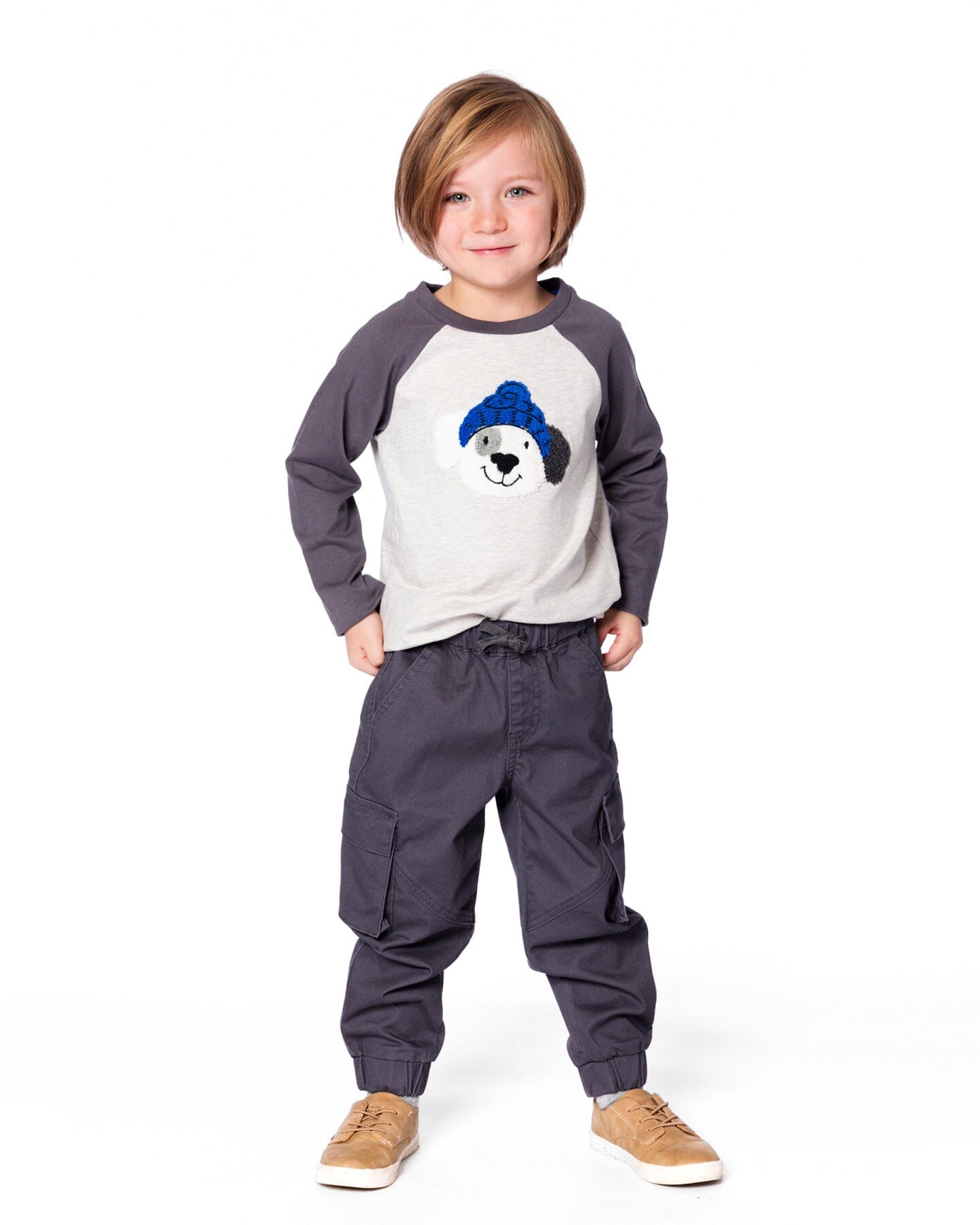 Contrast sleeves add sporty style to this playful jersey top. Made from super-soft organic cotton fabric, this tee features long sleeves, a contrast ringer crew neck, a curved back hem, and an adorable dog graphic on the chest. Layer it under a full zip hoodie from our My First Ski Trip collection for a fresh, layered look!