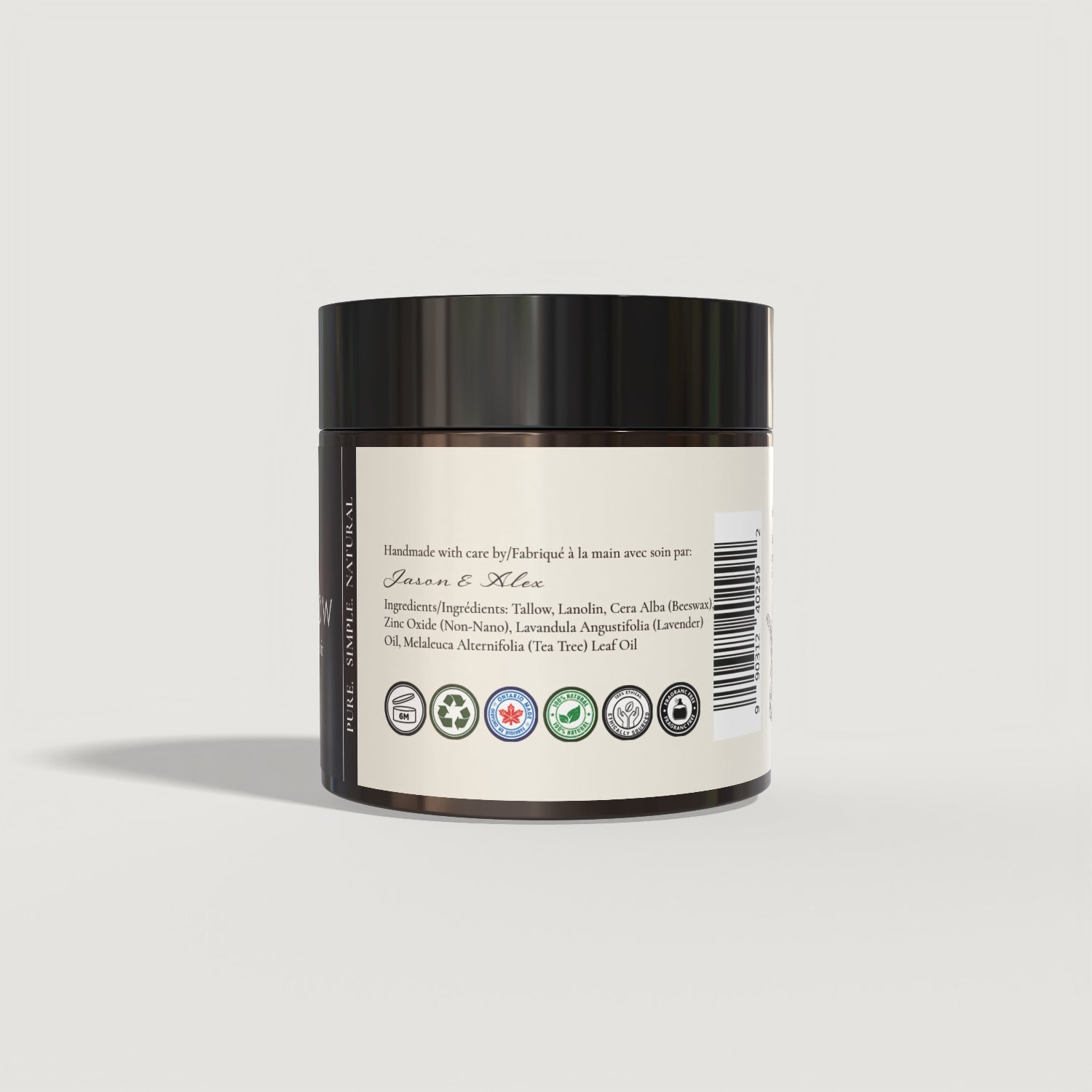 Tallow (Bovine), Lanolin (Sheep-Derived), Cera Alba (Beeswax), Zinc Oxide (Non-Nano), Lavandula Angustifolia (Lavender) Oil, Melaleuca Alternifolia (Tea Tree) Leaf Oil