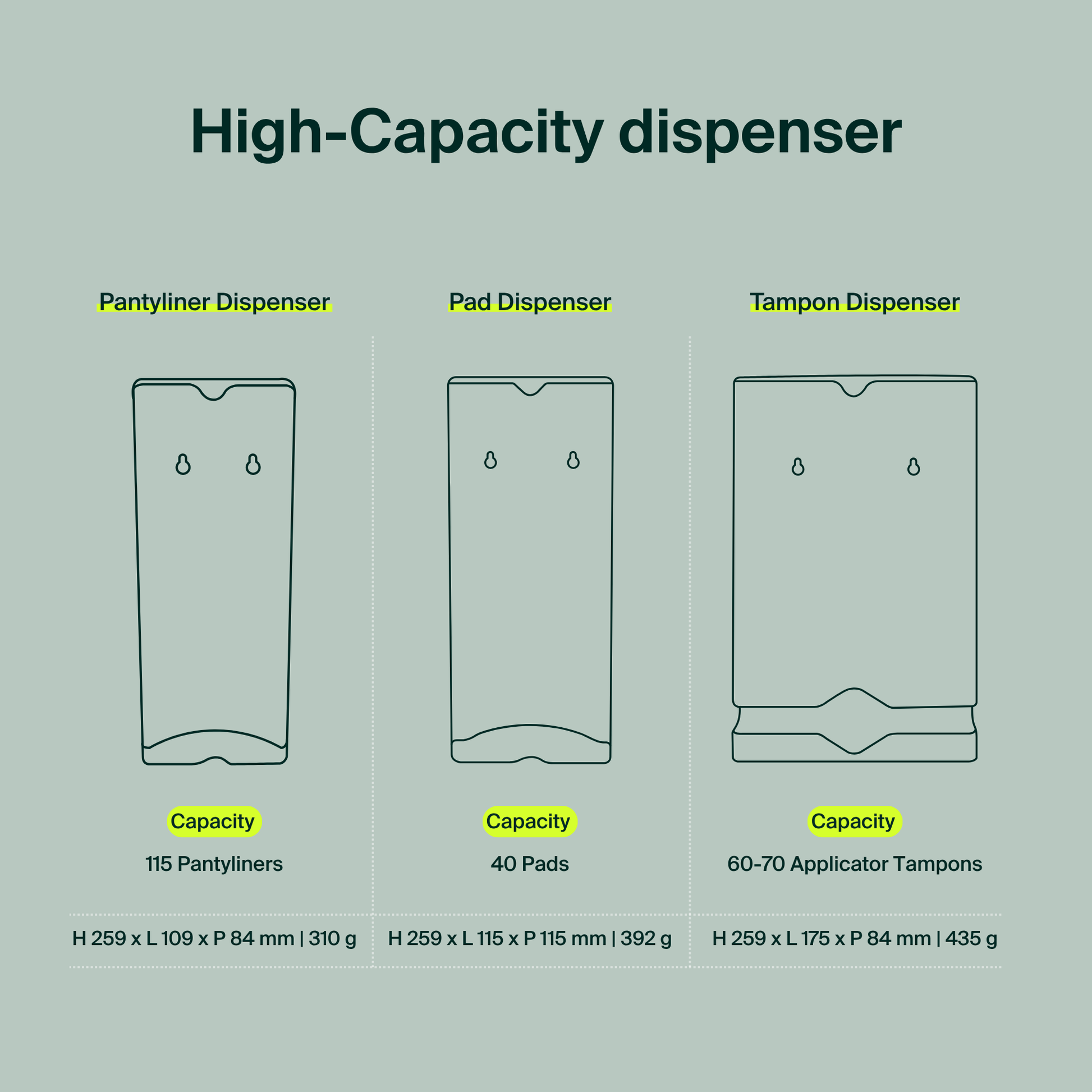 Unlike cabin dispensers, these have greater tampon storage capacity. These dispensers are ideal for washrooms serving more employees, or for organizations wishing to extend refill intervals.