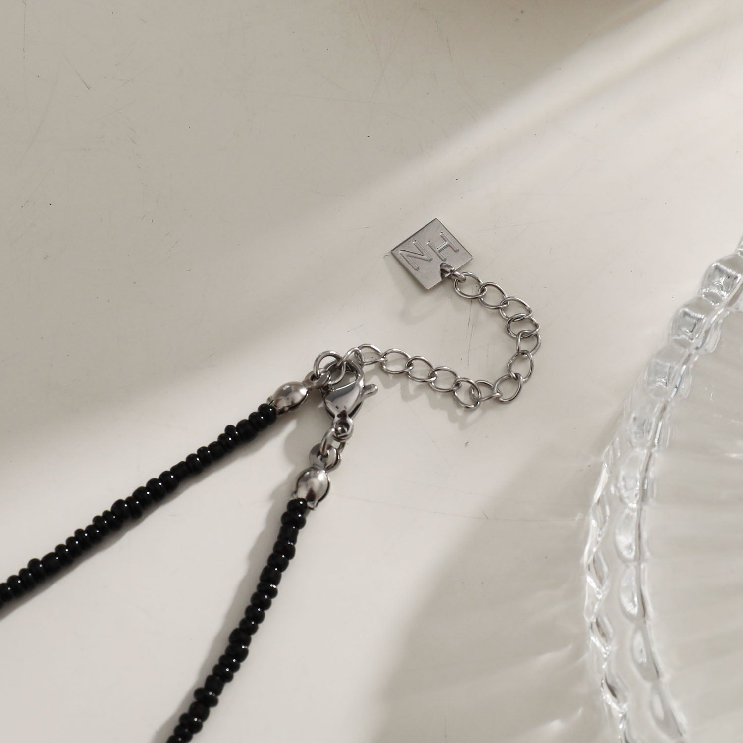 RITA Black & Silver Beaded Chain Necklace with Etched Silver Tooth Pendant