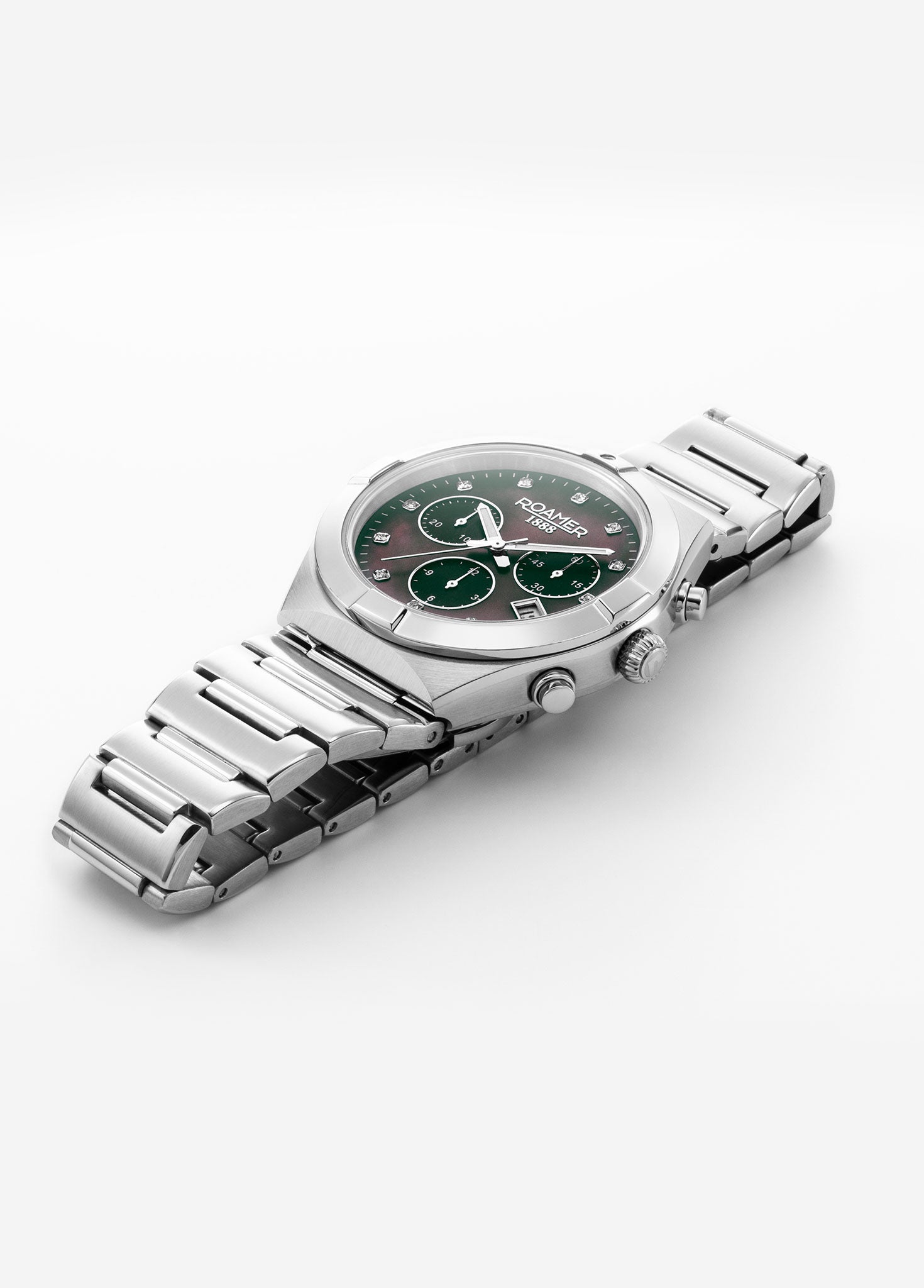 The Roamer Eos Chronograph 987837-41-80-20 is a sophisticated Swiss-made ladies’ watch that blends elegance with precision. Its 38mm stainless steel case houses a luxurious black mother-of-pearl dial, accented with chronograph sub-dials for added functionality. A scratch-resistant sapphire crystal ensures lasting clarity, while the Swiss Ronda 5030.D quartz movement delivers accurate and dependable performance. With 10 ATM water resistance, it is suitable for swimming and daily wear, offering both beauty and resilience. The stainless steel bracelet with a butterfly clasp provides comfort and security, making this timepiece a versatile companion for any occasion.