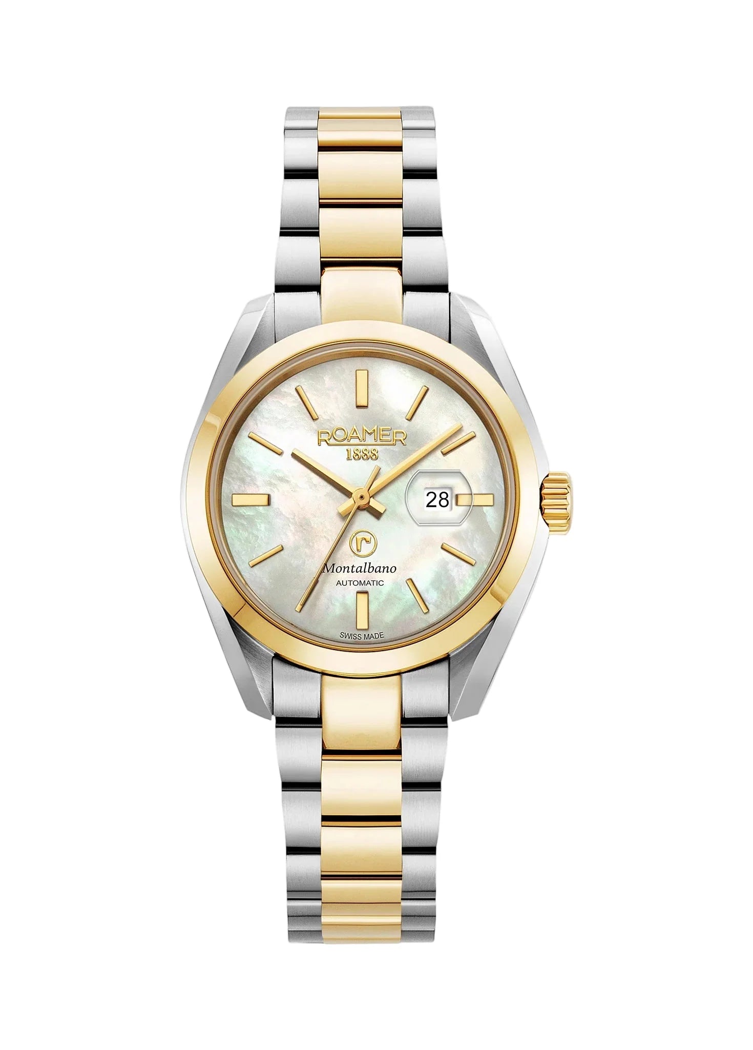 The Roamer Montalbano 996990-47-20-20 blends timeless elegance with Swiss craftsmanship in a refined two-tone design. Its 31mm stainless steel case with gold accents frames a luxurious white Mother of Pearl dial, complete with applied indices and a date display at 3 o’clock. Protected by a scratch-resistant sapphire crystal, the dial remains brilliantly clear while the Sellita SW100 automatic movement delivers precise, battery-free timekeeping. With 10 ATM water resistance, this watch is suitable for swimming and everyday wear, while the two-tone bracelet with butterfly clasp ensures a secure and stylish fit. Perfectly balancing durability with sophistication, the Montalbano is a versatile choice for any occasion.