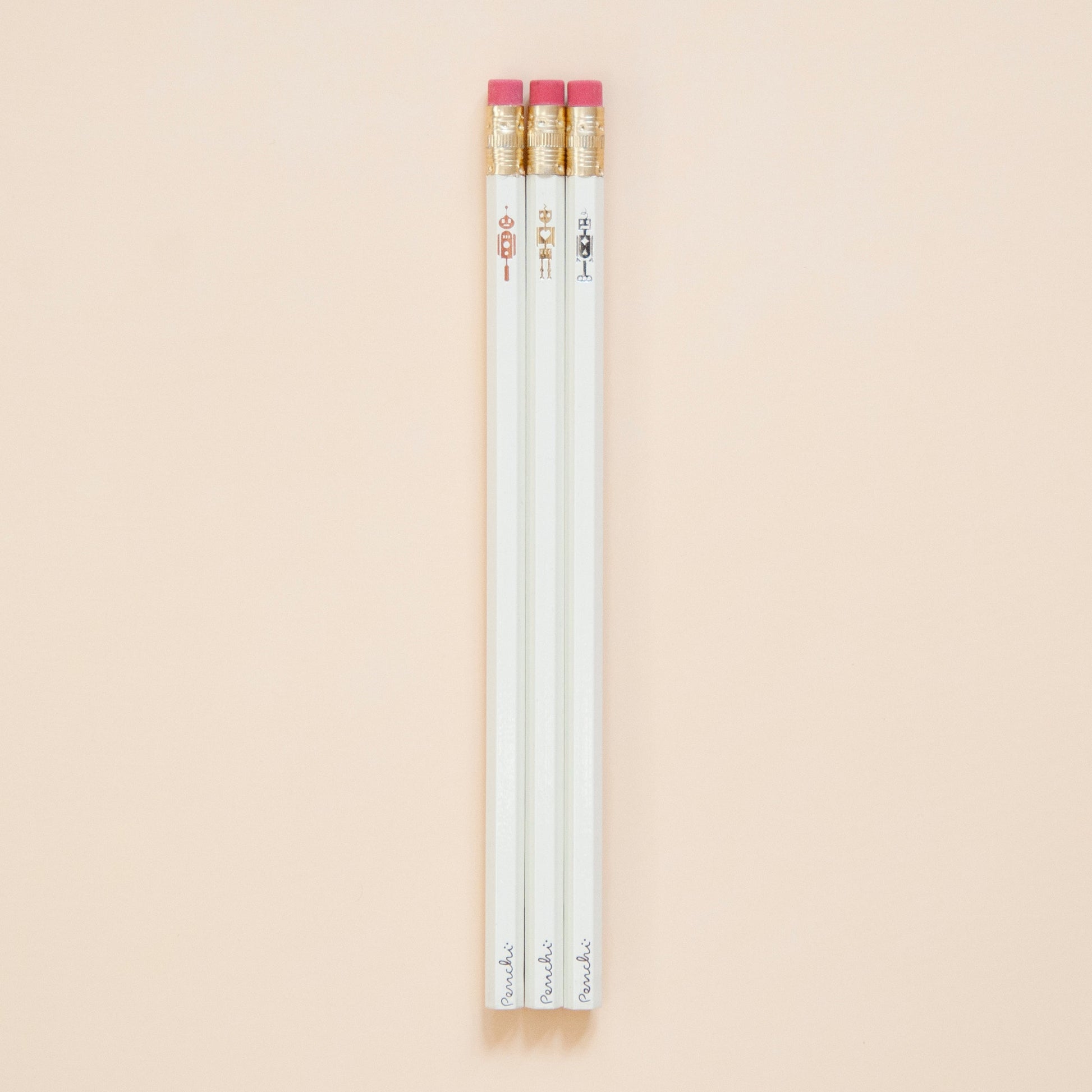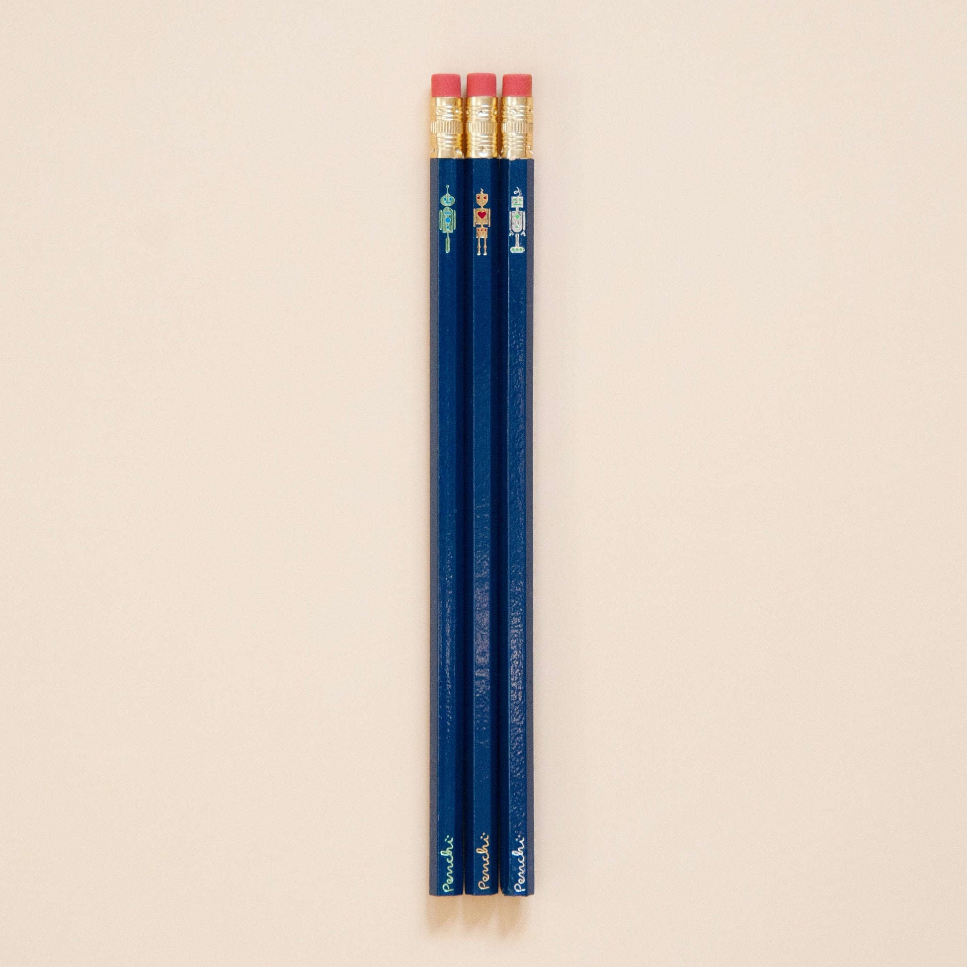 This novelty pencil set features three tiny robots named Zat, Solo, and Talus. They will keep you company during your study sessions. In this set (Set 1) each robot is stamped with a base colour for the body, and then a secondary colour for the details. The remaining pencils feature a single-colour robot design.