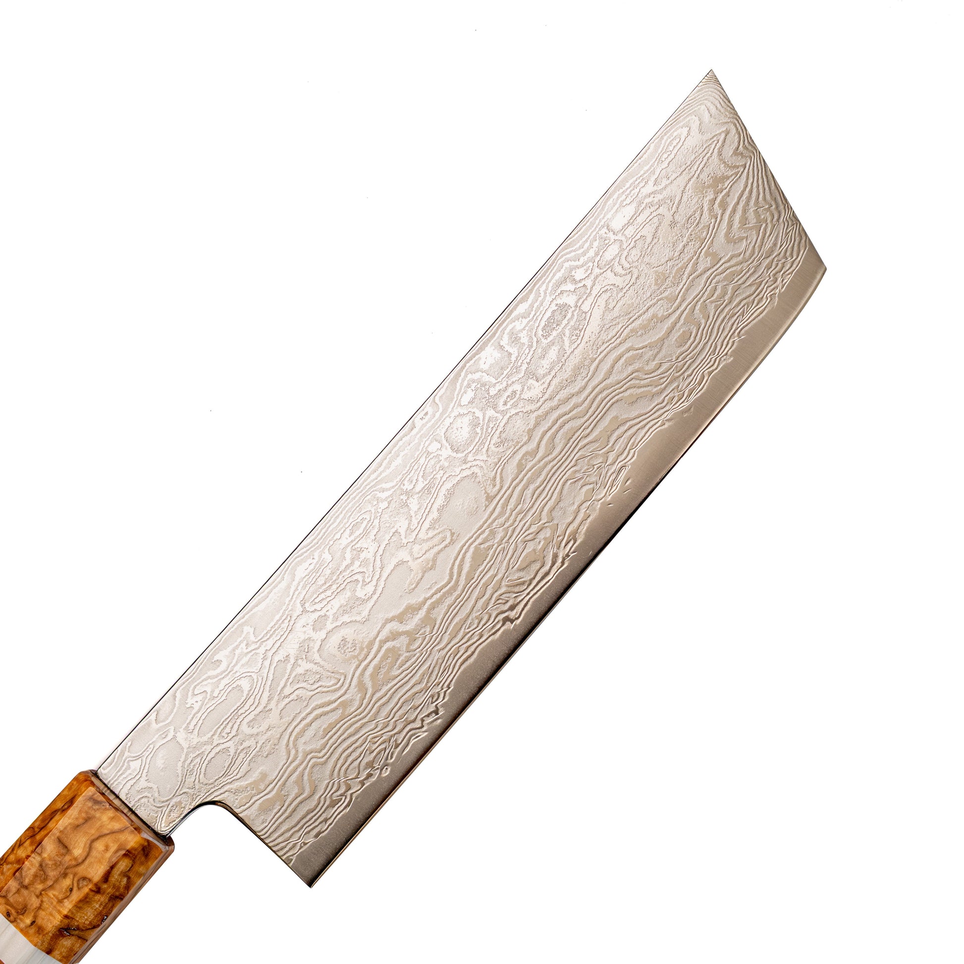 The octagonal Japanese-style handle is made of curly maple, characterized by its natural color tone, providing a gentle texture and grip. Octagonal handles have long been popular not only because the number eight is considered lucky in Japan, but also they are easy to grip.