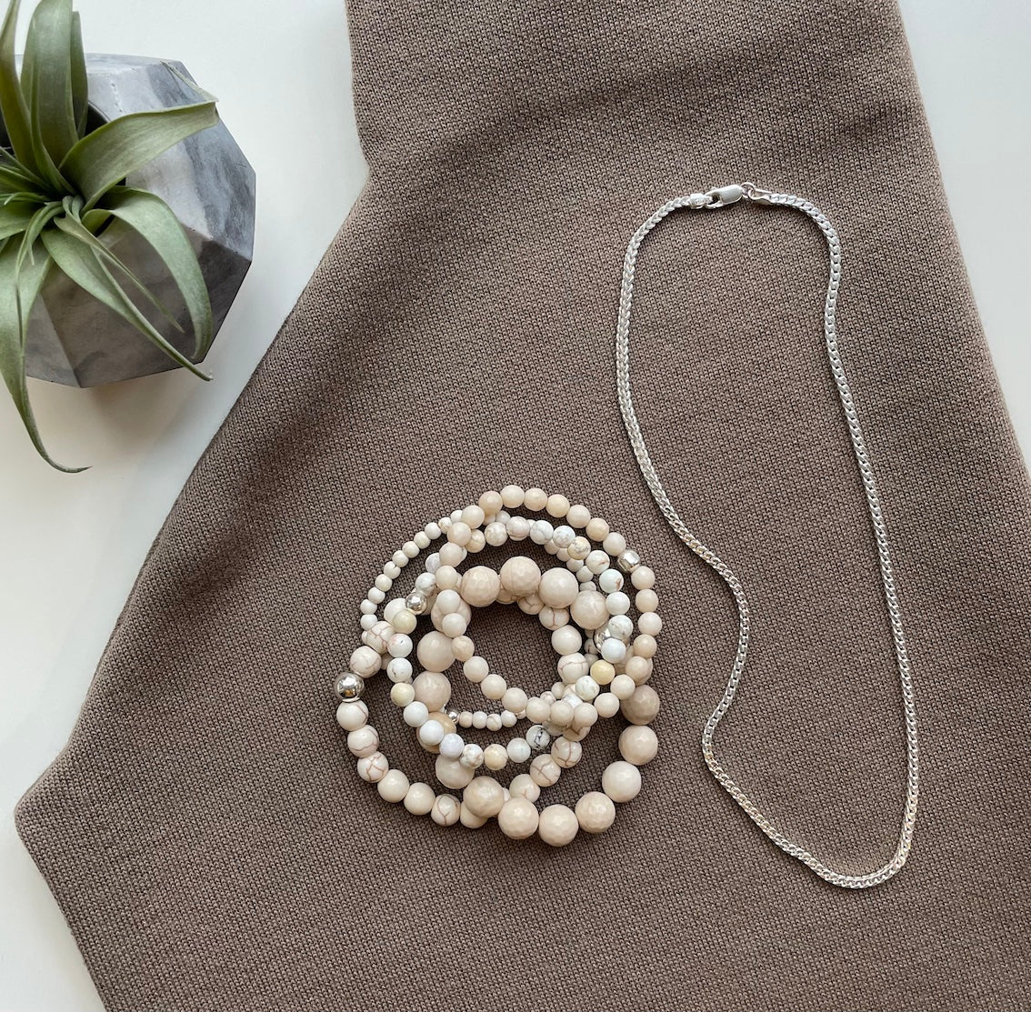 1 x Howlite Bracelet (regular $40) with 6mm round stones with grey and extra creamy oatmeal colour variation. Includes a 6mm shiny, round Sterling Silver spacer bead.