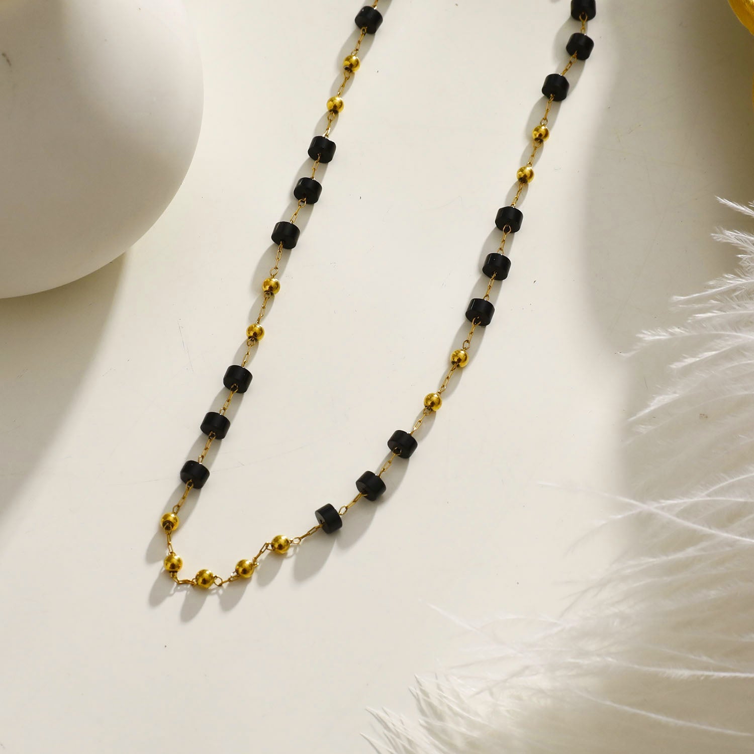 A combination of gold metal beads and black onyx beads create a unique piece of accessory that is bound to add some interest to your outfit.
