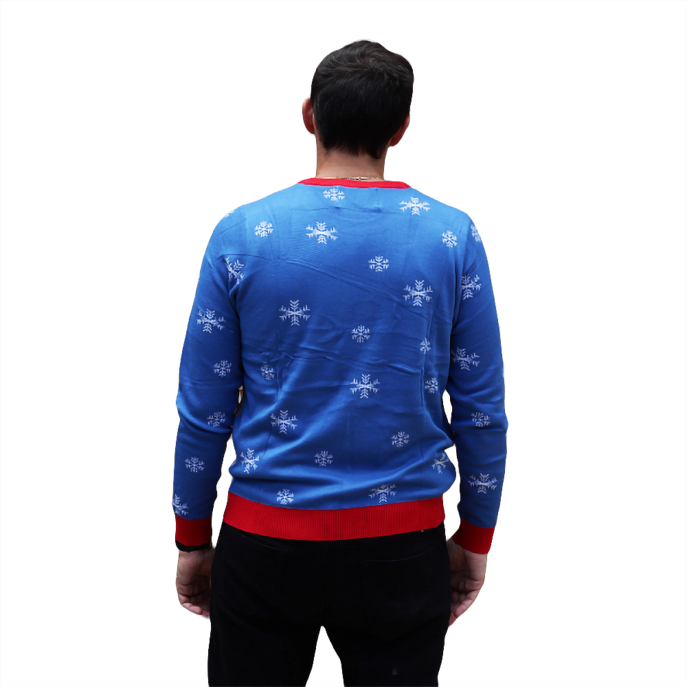 If you feel like you’re done playing it safe at Christmas parties, this is the sweater choice for you! It’s got a great colorful design, a snowman and snowflakes which are essential for that festive feel and Santa! Just not in the traditional way we’re used to seeing him. It’s Santa 2.0. Santa caught in the act, ‘cause hey, a man’s gotta go when a man’s gotta go.