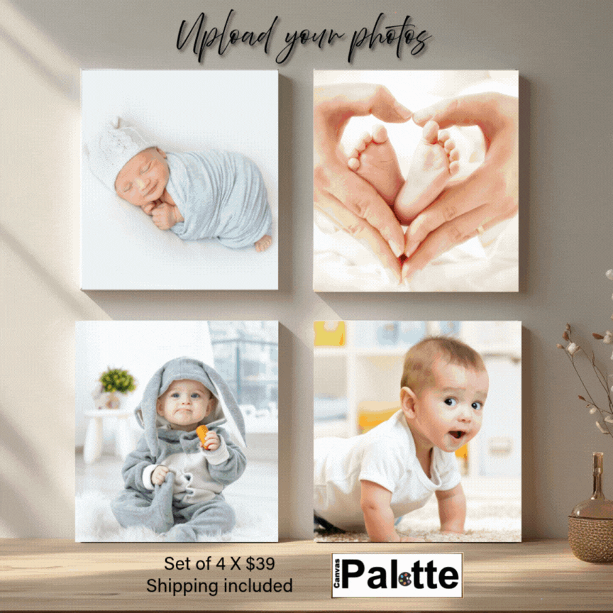 A set of four 8"x 8" gallery-wrapped custom canvas prints designed to transform any space. Whether you want to display a family photo, an inspirational quote, or a mix of images and text, this versatile print set offers unlimited possibilities.