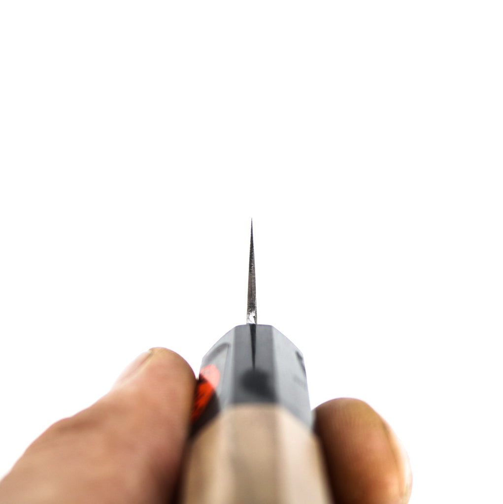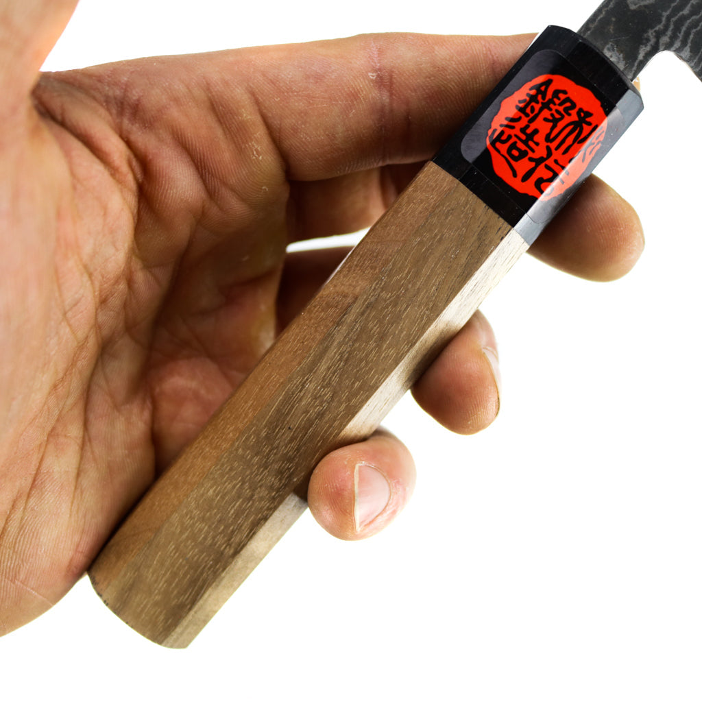 This petty has a great feel in hand and is light and nimble while still having good stiffness and strength. The thin tang and added depth to the blade make this a great petty for small on the board tasks like shallots, garlic, and chives, but it wont get in the way when its time to break down a chicken or debone that pork shoulder. A great knife for home cooks to pair with a larger knife like a gyuto or santoku, and great for the professional for intricate prep or to leave on your station during service when you don't have room or time to set up a larger cutting board and pull out a larger knife from your roll.