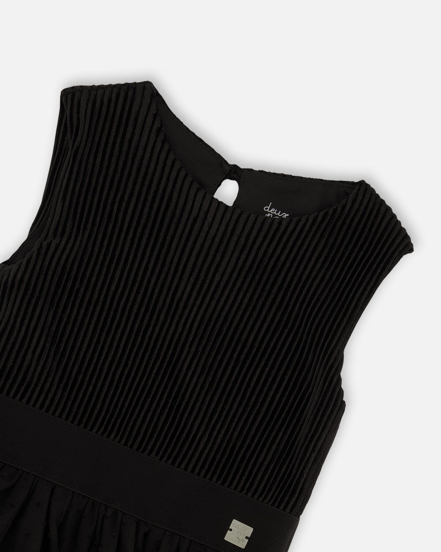 Our Sleeveless Dress with Tulle Skirt Black is absolutely charming in a flared silhouette with ultra-girly details. This special occasion dress features a sleeveless bodice with a round neckline, a stretch elastic waistband that makes it oh-so-comfortable to wear, and a flared tulle skirt with a dot print and little ruffles. It's a perfect choice for the stylish little girl who loves to look chic!