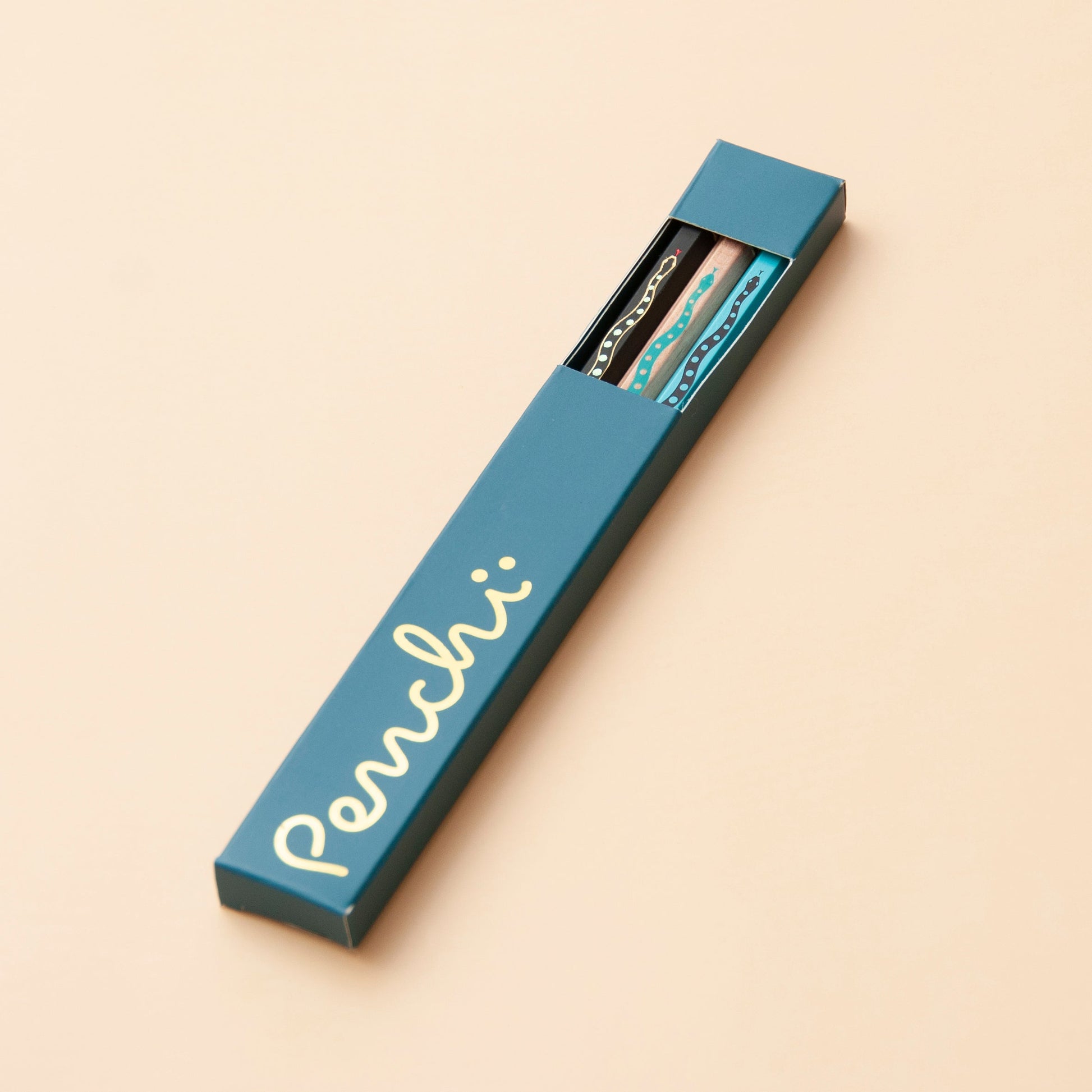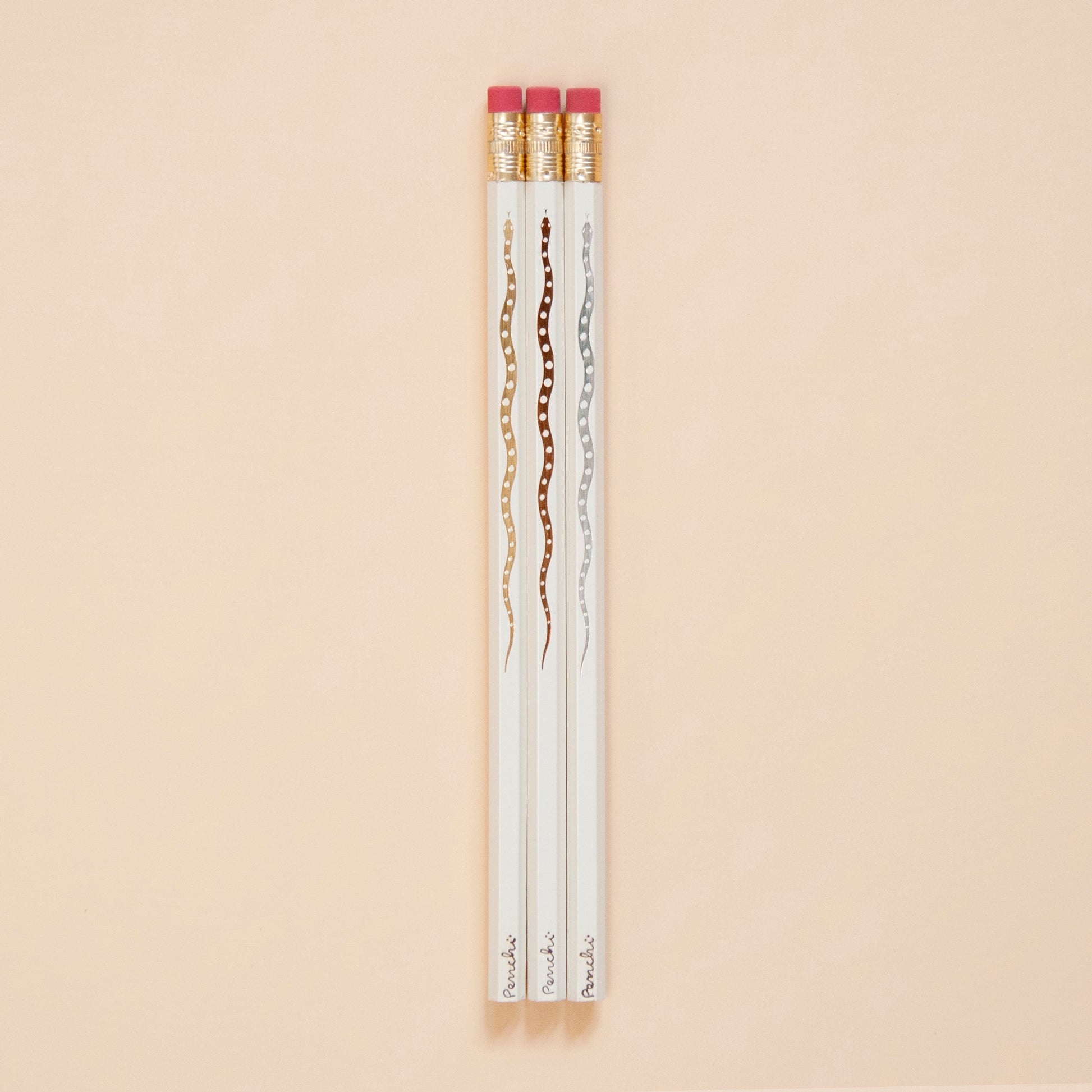 This novelty pencil set features a long snake. The flagship pencil in this set (Set 1) is the matte black pencil which features a unique 3-stamp snake design: a metallic gold outline, metallic pale green spots along the body, and a metallic red tongue. The remaining pencils feature a single-colour snake.