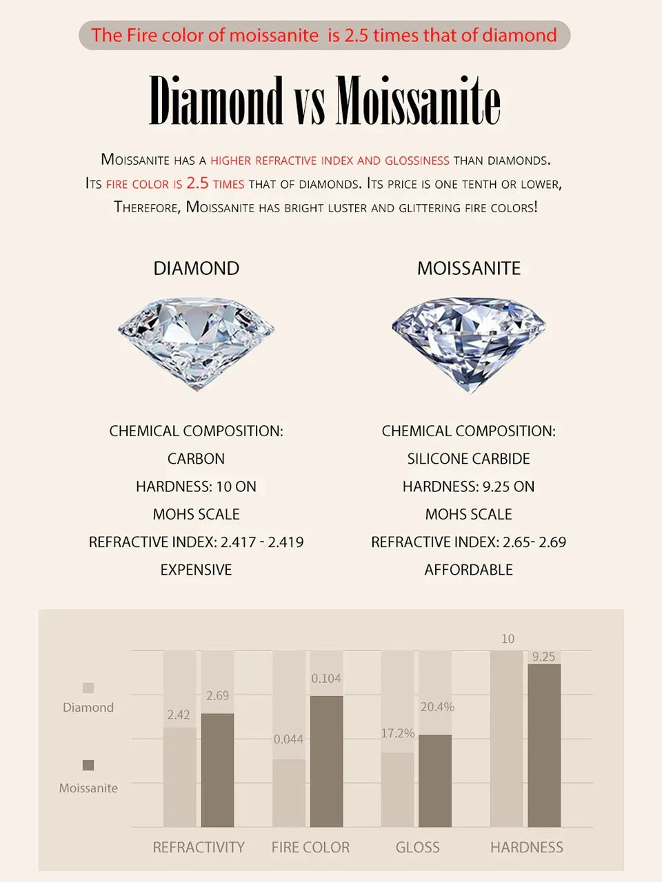 - Moissanite: 6.5mm/1.0ct