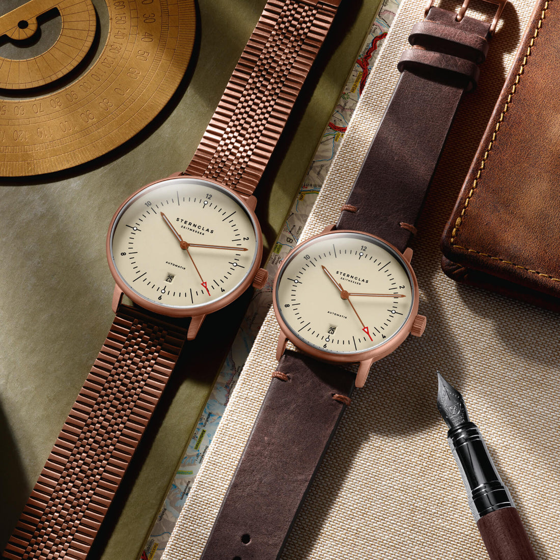 The Sternglas Naos Automatic Bronze blends vintage warmth with modern precision. Its brushed bronze PVD case naturally develops a patina over time, framing a satin-finished alabaster dial with luminous hands for enhanced readability. A domed sapphire crystal with double anti-reflective coating ensures durability and clarity, while a transparent case back reveals the automatic movement.