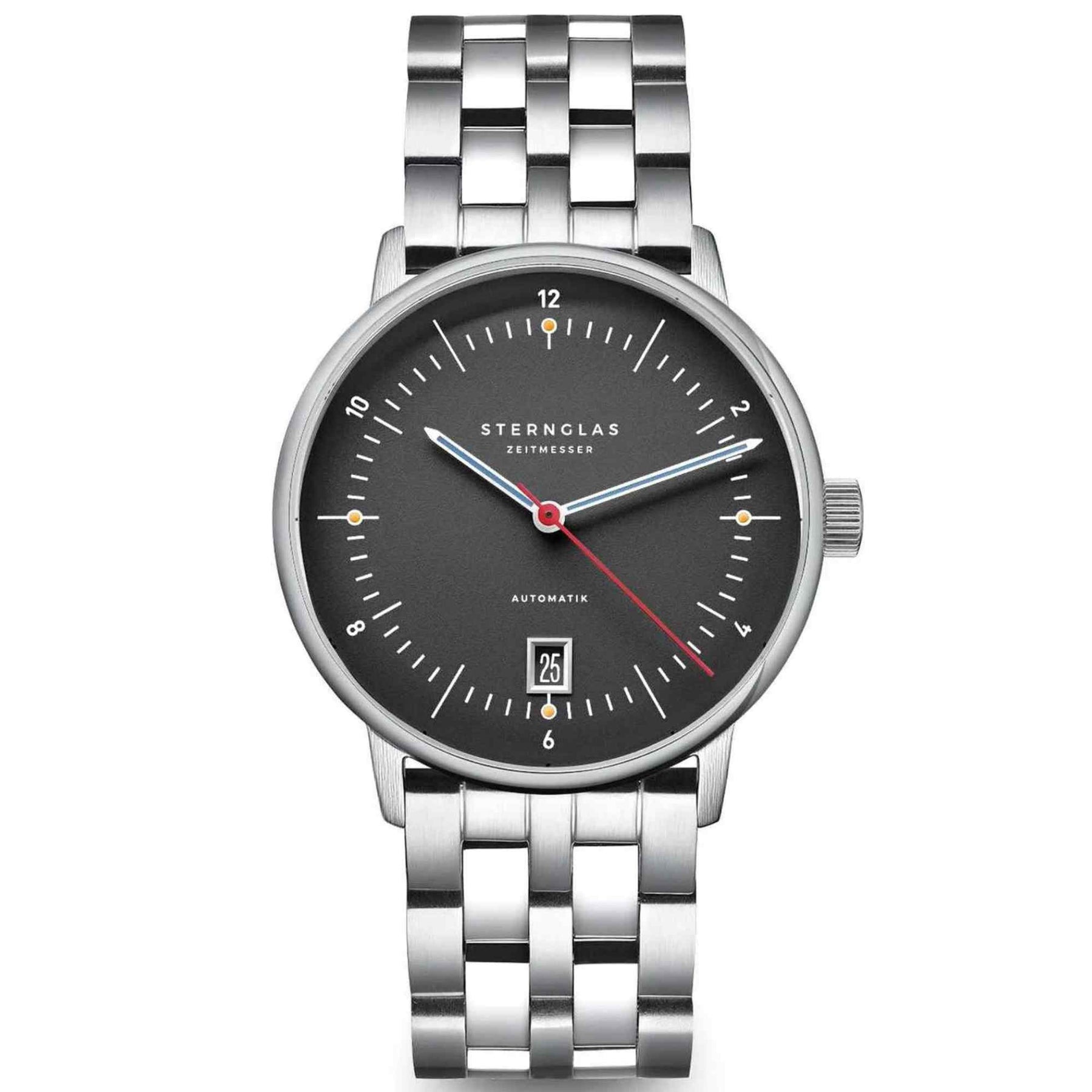The Sternglas Naos Pro Automatik delivers a refined interpretation of Bauhaus minimalism through its anthracite curved dial, housed in a polished and brushed 38mm stainless steel case with an ultra-slim 9mm profile. A domed sapphire crystal with double anti-reflective coating ensures excellent clarity and long-lasting protection, while Luminova-coated hands provide reliable legibility in low light. Powered by the high-precision Miyota 9015 automatic movement, the watch offers smooth mechanical performance with hacking seconds, manual winding, and a practical date function. Completed with a 20mm solid stainless steel link bracelet and rated to 5 ATM water resistance, this Naos Pro edition blends sophistication, durability, and everyday versatility with exceptional craftsmanship.