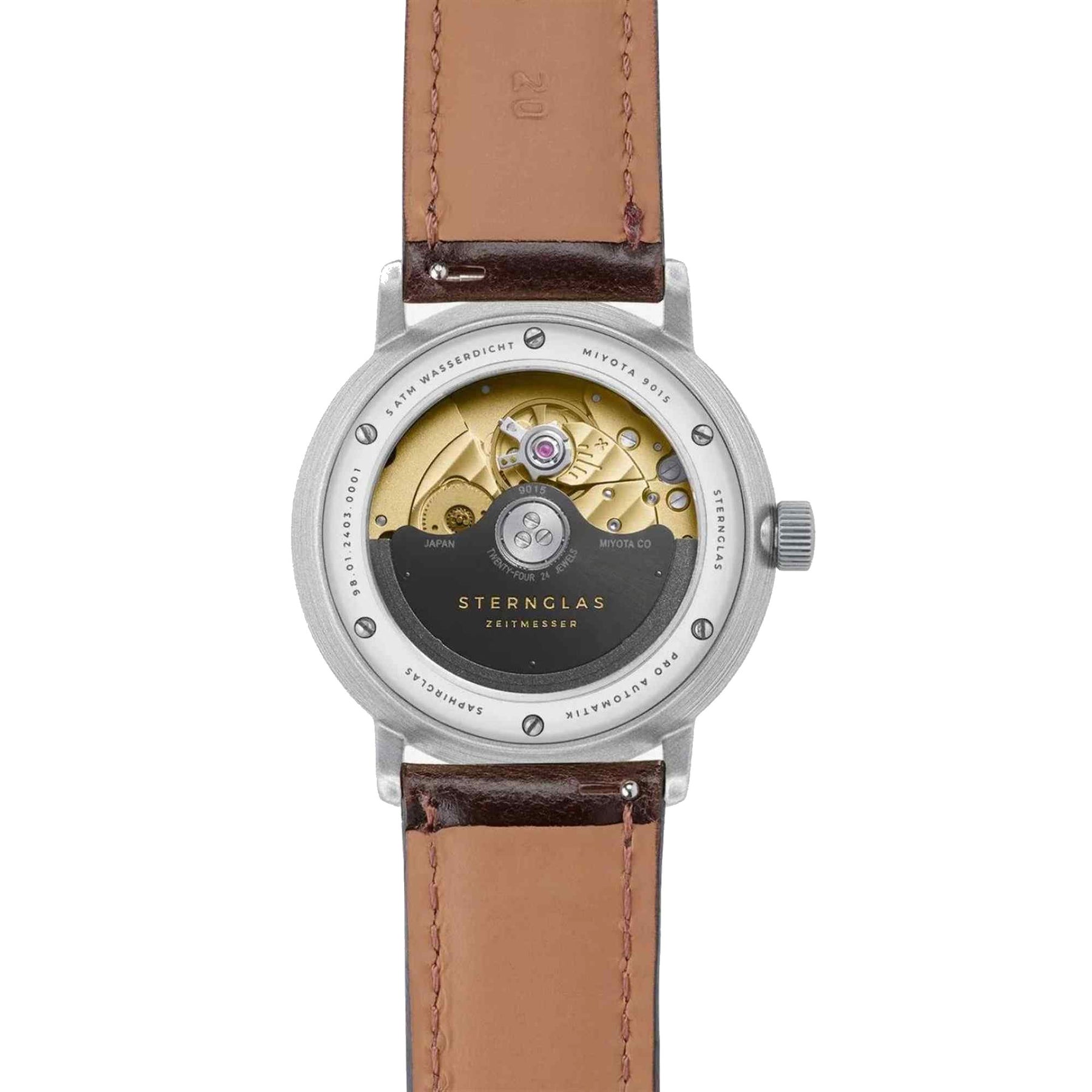 The Sternglas Naos Pro Automatik brings refined Bauhaus minimalism into a slim 38mm polished stainless steel case, paired with an anthracite grey dial for a modern and understated look. A domed sapphire crystal with double anti-reflective coating provides exceptional clarity and protection, showcasing the clean layout and luminous hands designed for enhanced readability. Powered by the Miyota 9015 automatic movement, the watch offers precise mechanical performance with hacking seconds, manual winding capability, and a practical date function. Completed with a 20mm dark brown Bridle leather strap and rated to 5 ATM water resistance, this Naos Pro edition blends sophistication, durability, and everyday comfort.