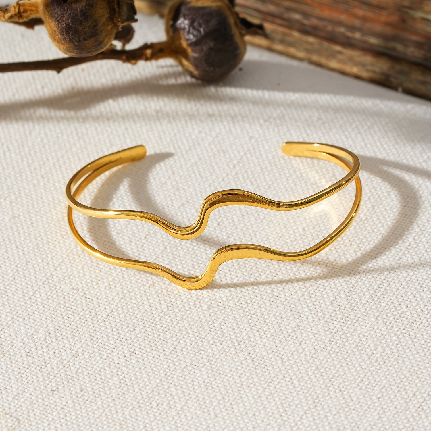 Elevate your style with our industrial-chic inspired bracelet, expertly designed with a pair of abstract shaped bands stacked for a striking and contemporary look. This unique piece combines the rugged appeal of industrial design with the elegance of modern jewelry, making it a must-have accessory for the fashion-forward individual.
