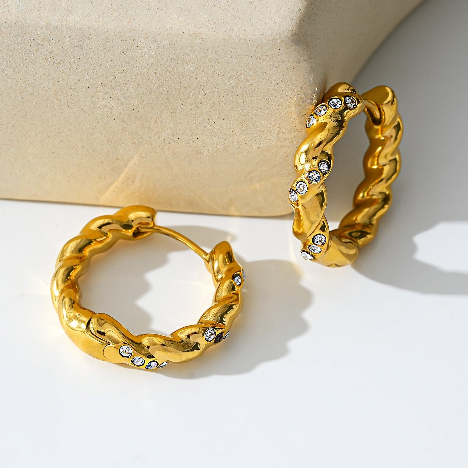 Style KAMENZ: Twisted Textured Hoop Earrings with Zirconia Embellishments.