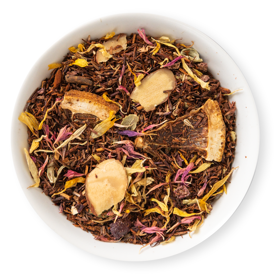 The natural sweetness of premium rooibos provides a perfect base for decadent pieces of almond, orange and spice. This blend has an intoxicating aroma and a sweet creamy taste reminiscent of amaretto. Perfect for making a tea latte.